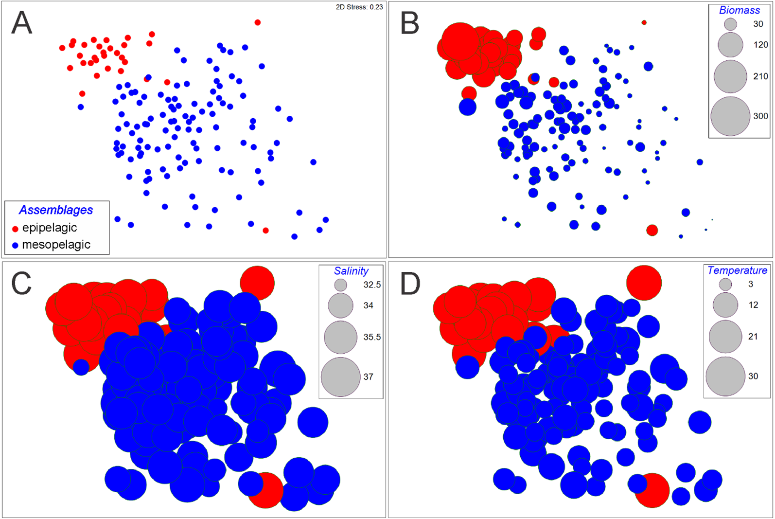 The ‘epipelagic’ assemblage was represented by the first sampling level of 0-200 m depth, and the ‘mesopelagic’ assemblage was composed by the four sampling levels between 200-1000 m depth. For each season, a nMDS analysis was applied to the similarity matrix, and the environmental variables (zooplankton biomass, temperature, salinity) were also plotted as bubbles to represent their influence on the structure of the assemblages. The correlation between the biological and environmental matrices was evaluated using a BEST-BIOENV test based on Spearman’s rank correlation coefficient (Clarke and Ainsworth, 1993). Besides, to test the difference between the two assemblages, an ANOSIM hypothesis test (9999 permutations) was performed. The R ANOSIM test is a non-parametric method based on ranks used to determine if two or more groups are statistically different. The R values near 1 indicate differences among groups, whereas values near zero suggest more similarity among them. Furthermore, a SIMPER analysis was also used to determine the taxa with the greatest contribution to the separation of assemblages. These analyses were carried out with PRIMER v7 software (Clarke et al., 2014). The amphipod abundance data were plotted on vertical transects of temperature using the SURFER v15 software.