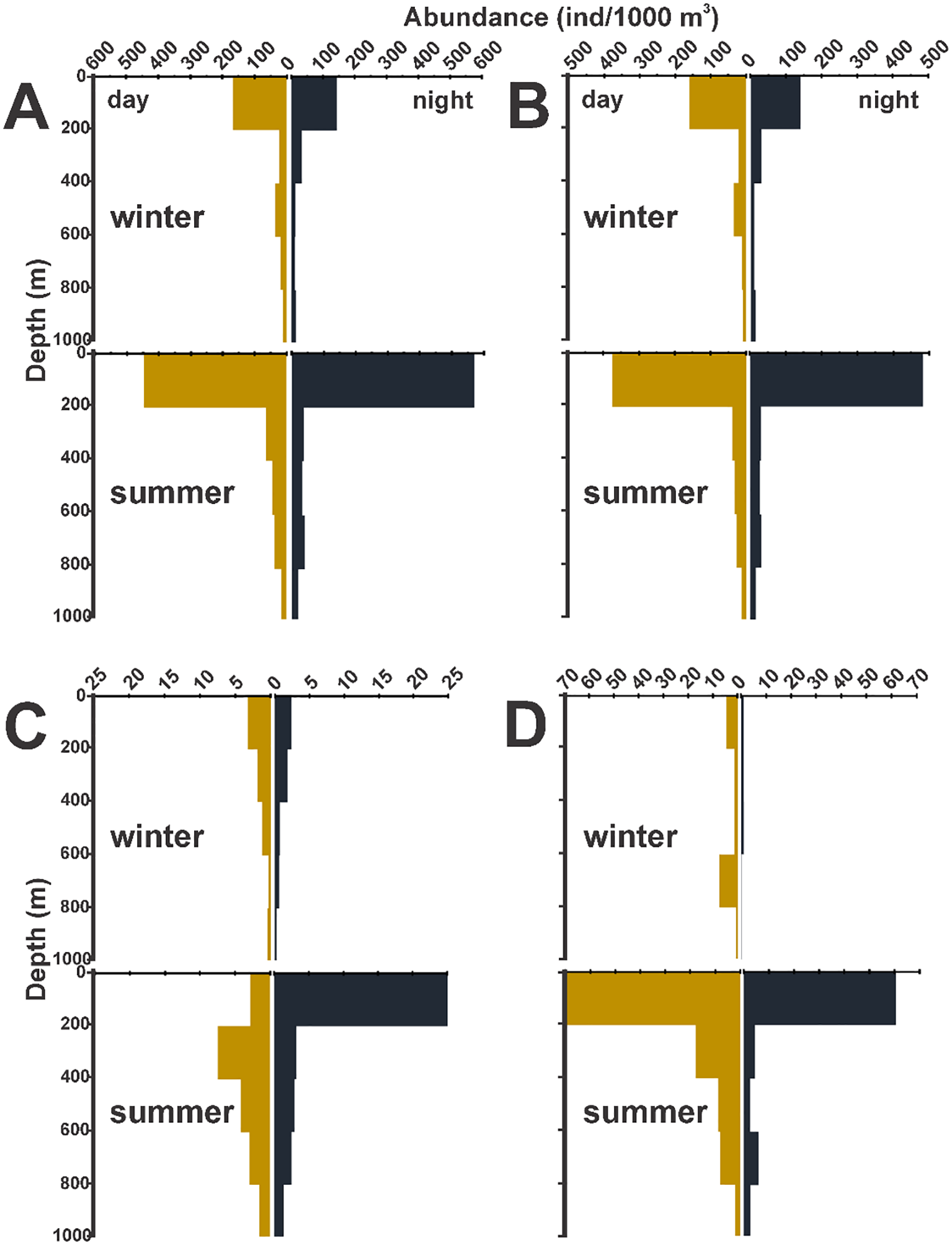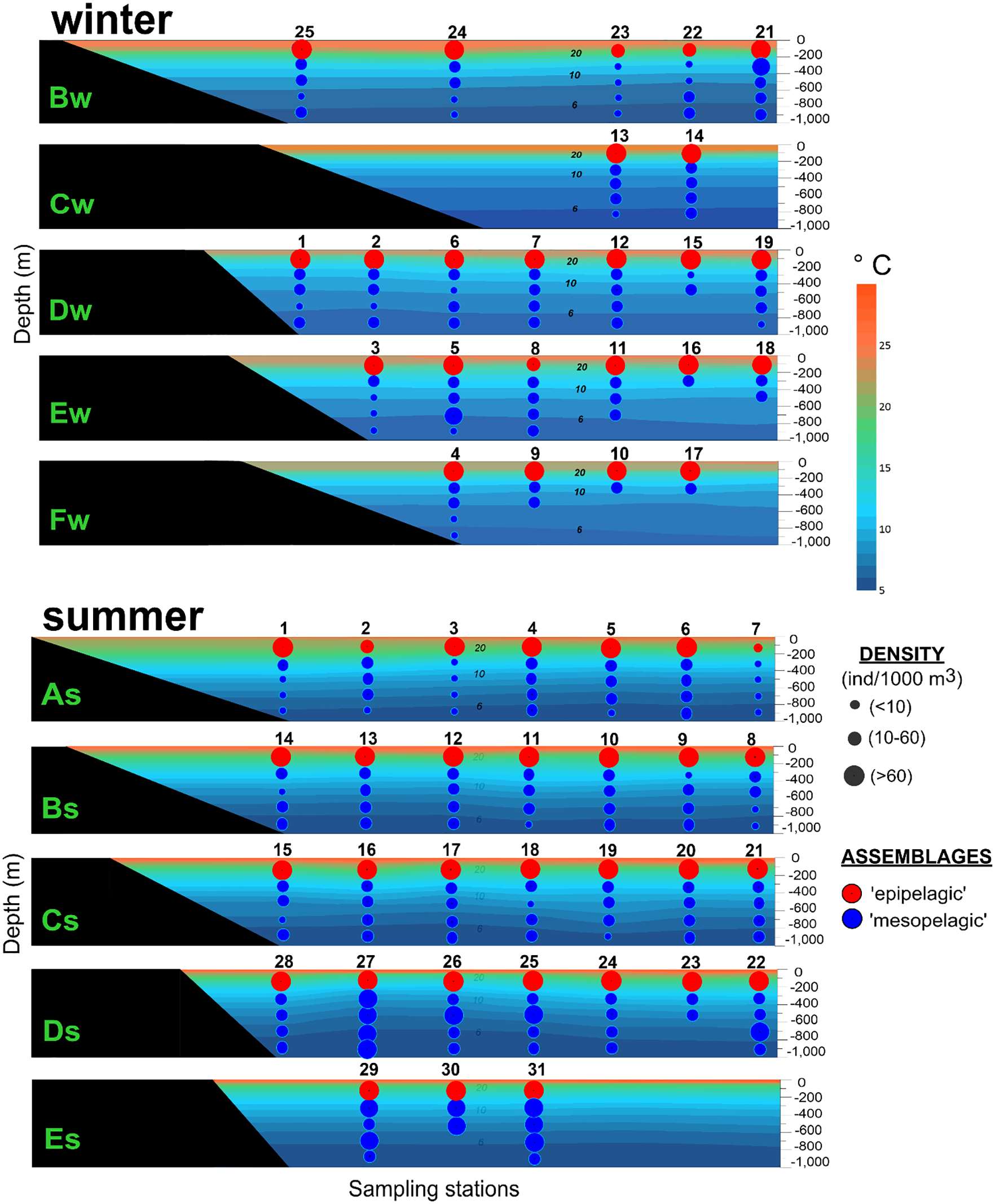In total, 9574 individuals were separated, and 120 species were identified: 87 in winter (‘epipelagic’: 69 species; ‘mesopelagic’: 76) and 115 in summer (‘epipelagic’: 88; ‘mesopelagic’: 108) (Table 1).