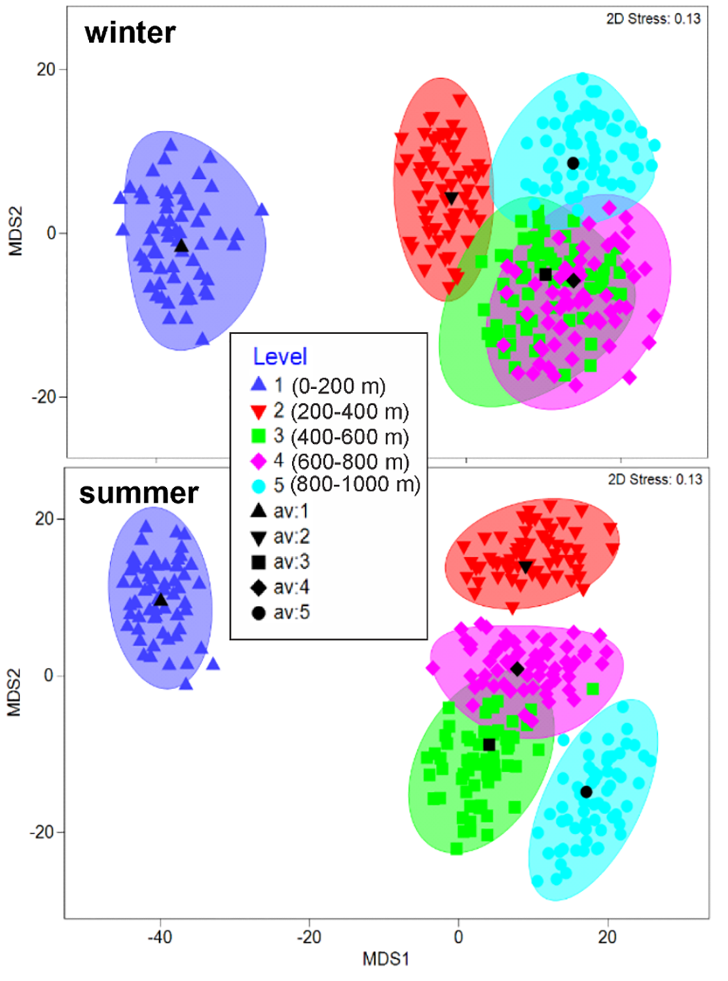 For each sampling season, the species/stations matrix was transformed by applying a square root to smooth the bias of dominant species, and after that, the Bray-Curtis similarity index was applied. Then, to probe the differences in the vertical plane, the amphipod community was analyzed from two points of view: first, considering two assemblages defined a priori, the ‘epipelagic’ and the ‘mesopelagic’; and second, considering each of the five sampling levels as separate groups.