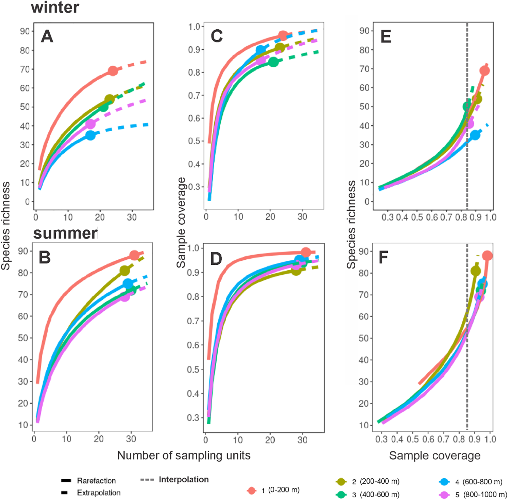 The two assemblages were also compared in terms of diversity. In both seasons, we used species accumulation curves of alpha diversity with interpolation-extrapolation of Hill Numbers and the incident-based estimator Chao2 (Chao and Jost, 2012). In addition, we estimated the sample completeness to infer the representativeness of the sampling effort of each assemblage (Chao and Jost, 2012), considering a common sampling coverage value of 0.95 to compare the alpha diversity. This integrated methodology yielded less biased comparisons between a set of communities by the use of an equal sample coverage (completeness) value (Chao and Jost, 2012). Diversity analysis was performed with the statistical software R using the iNEXT package (Hsieh et al., 2016).