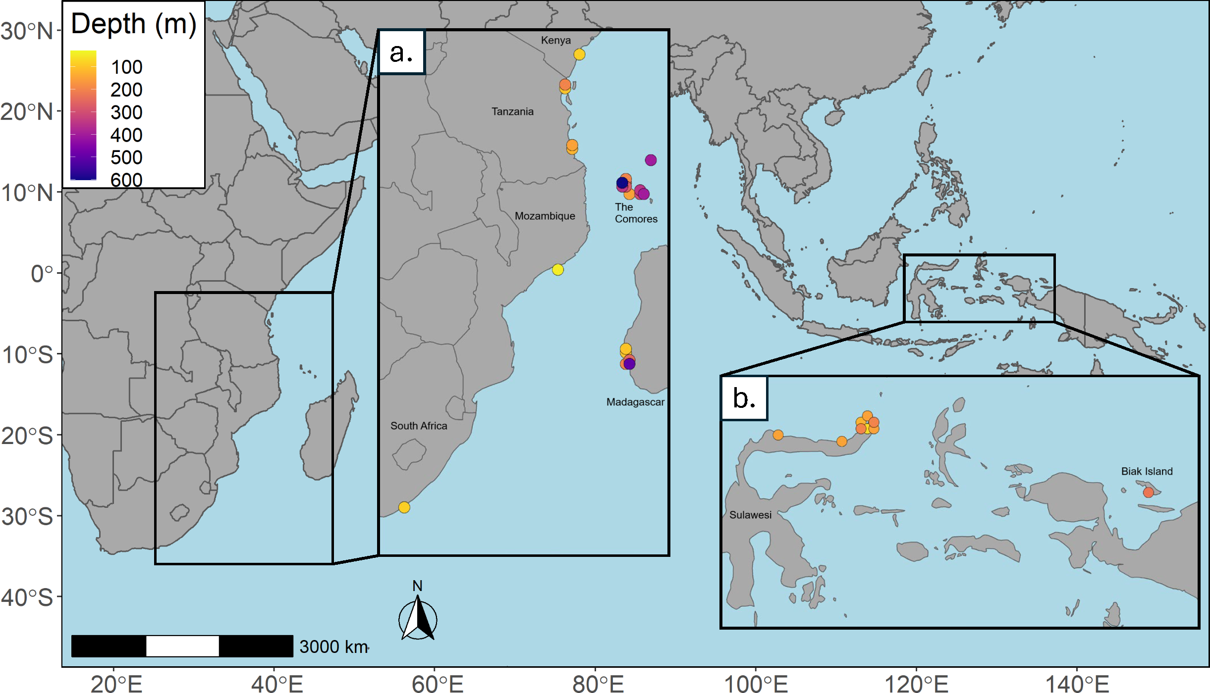 Species distribution modelling is used for understanding both extent of ranges and where to sample further for new populations. For coelacanths, past work has used 2D modelling approaches to make predictions of distributions for both species. In particular, Owens et al. (2012) produced global maps of potential coelacanth habitat, relying on the GARP and MaxEnt algorithms to generate models from 8 L. chalumnae records and 2 L. menadoensis records. Coro et al. (2013) later produced models of coelacanth distributions based on 21 records, simulated absences taken from an expert model, and artificial neural networks. Both groups projected their models onto the Indo-Pacific, the native range of L. menadoensis, and predicted similar suitable habitat concentrated between Sumatra, Borneo, and Southeast Asia.