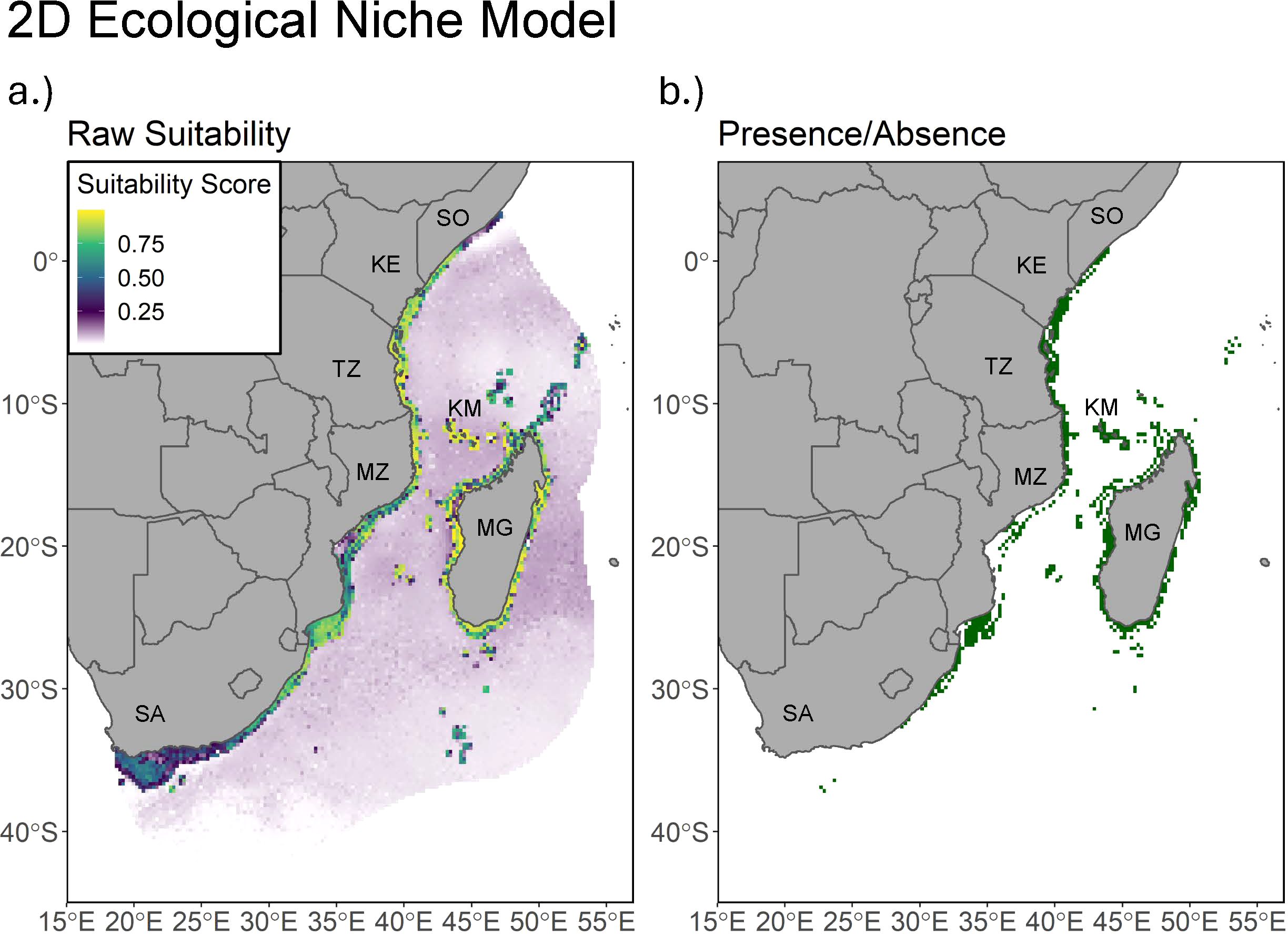 ENMs which incorporate depth are necessary to make accurate predictions of suitable habitat in marine environments for species like the coelacanth. While traditional 2D models may be viable for species with restricted depth ranges, one is unlikely to accurately capture the suitable habitat of species with wide depth distributions without accounting for environmental variability along the vertical axis. Enhanced scale resolution of environmental data at the bottom may correct this issue for species like the coelacanth which inhabit steep slopes, but this kind of precision is not currently available. It is subsequently vital that infrastructure exists to investigate and project species distributions in the third dimension to properly understand marine community dynamics, patterns of biodiversity, biogeography and speciation, and areas of conservation concern. This infrastructure will become increasingly relevant as commercial operations expand into the deep sea and conservationists reevaluate how reserves are delimited regarding depth (Jacquemont et al., 2024). As in the case of L. chalumnae and L. menadoensis, 3D modelling can give us a more detailed and accurate idea of where to look for further occurrences, as well as what areas may be of conservation interest.