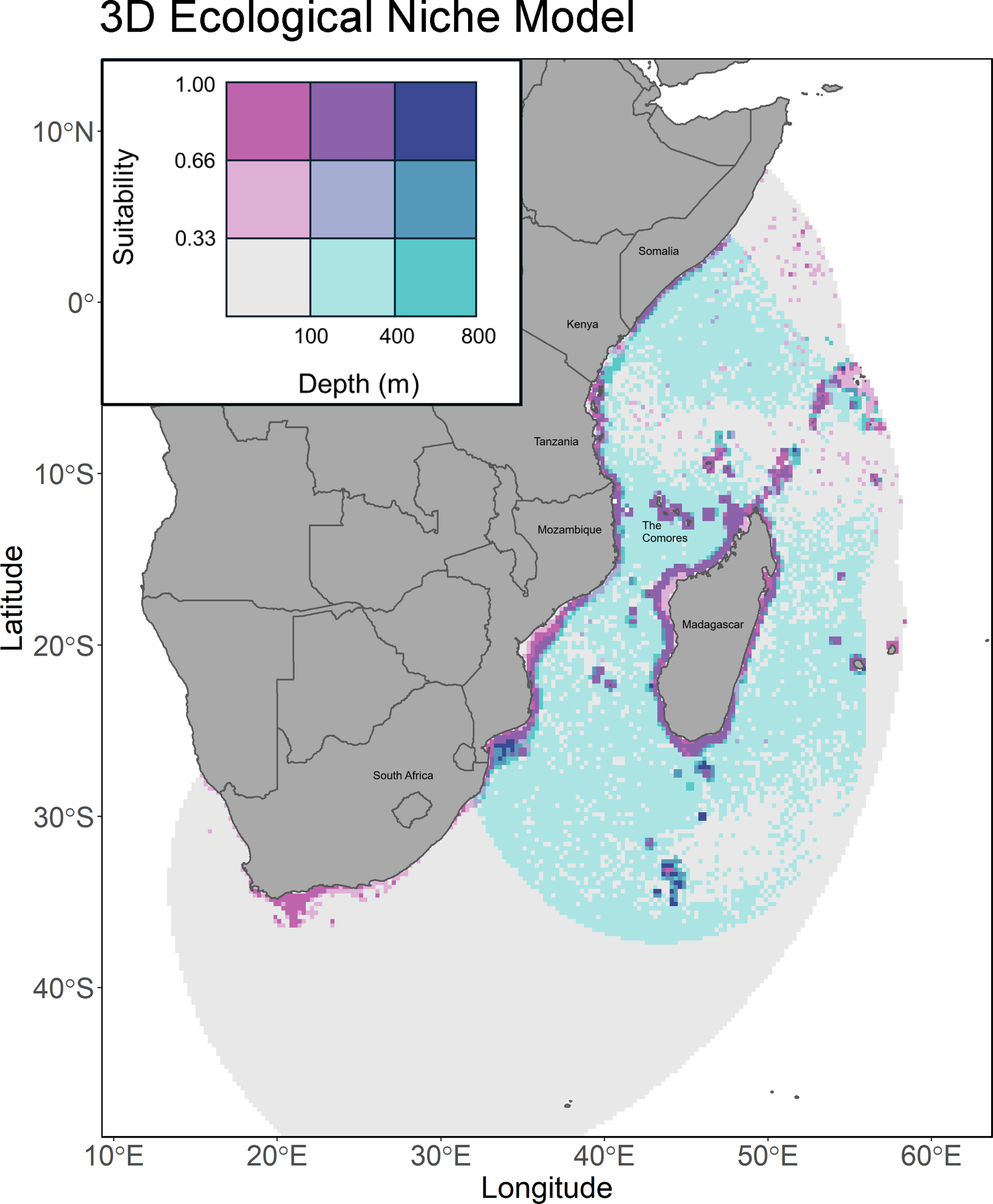 Incorporating depth results in improved model accuracy when predicting coelacanth habitat, and projecting into 3 dimensions can give us insights as to where to target future sampling. This 3D modelling framework can help us better understand how marine species are distributed by depth and allow for more targeted conservation management.