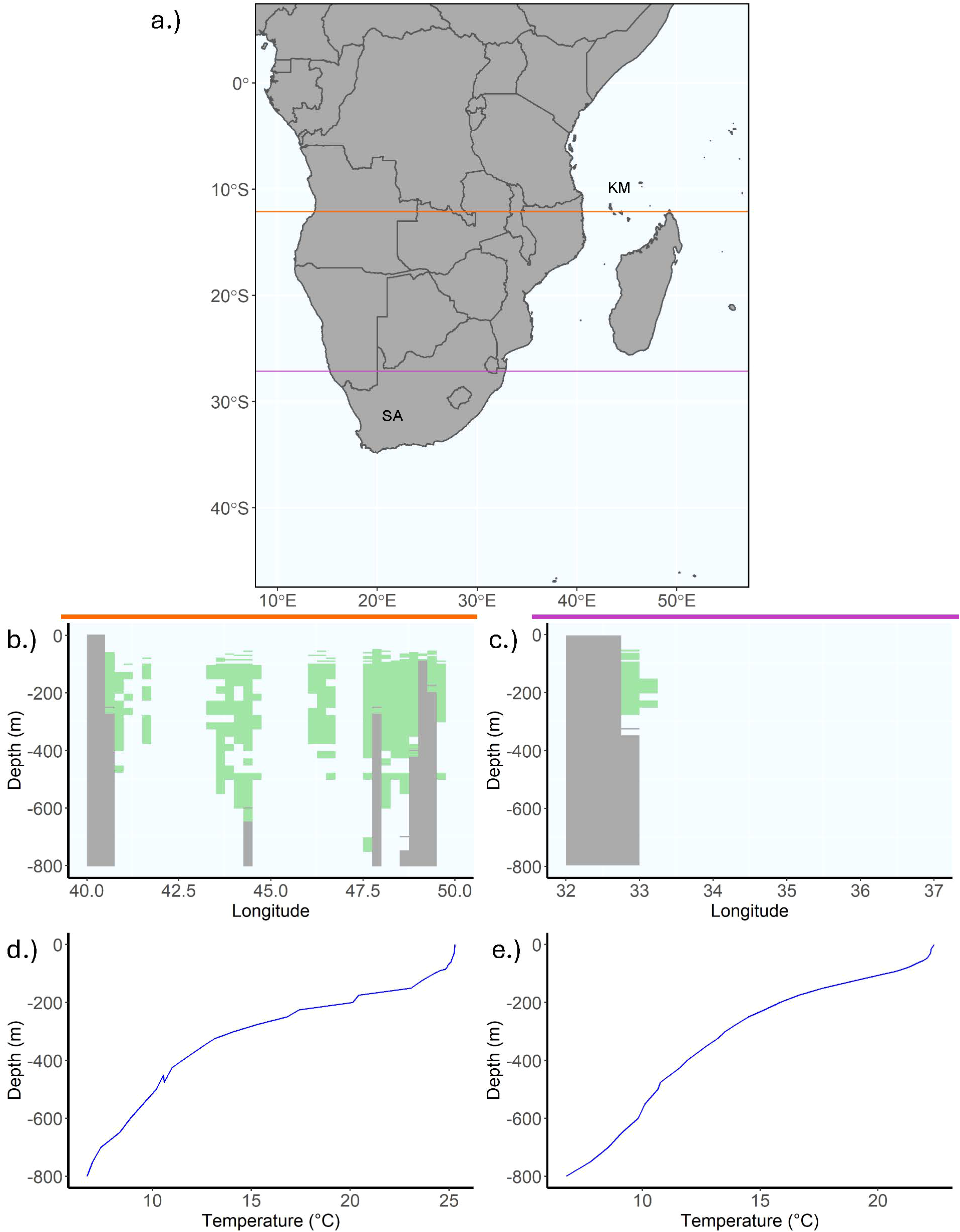 Plots of suitable L. chalumnae habitat by depth thresholded at the 0.8 sensitivity value, with abbreviated country names for South Africa and the Comoros. (A) is a 2D map of the area of interest from South Africa to Somalia, where the orange line at latitude -12.125 intersects the Comoros and corresponds to the two plots in the column below the orange line, and the purple line at latitude -27.125 intersects the Kwa-Zulu Natal and corresponds to the two plots in the column below the purple line. The first two plots below the colored lines depict thresholded coelacanth suitable habitat by depth in green while grey corresponds to either land or the benthos, in (B) the Comoros and off of (C) the Kwa-Zulu Natal. The final two plots depict temperature by depth at a given longitude in (D) the Comoros and off of (E) the Kwa-Zulu Natal. The temperature is about 5 degrees lower and the thermocline begins roughly 50 m shallower off the Kwa-Zulu natal compared to the Comoros.