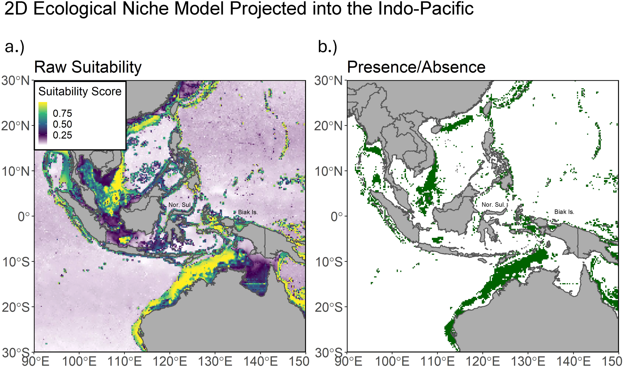 When projected onto the central Indo-Pacific, the 2D L. chalumnae model predicts a great deal of largely disjointed swaths of suitable habitat, namely between Vietnam and Brunei, along the Northwestern coast of Australia, the Eastern coast of the Philippines, the Western coast of Sumatra, and Western Papua (Figure 5). With the exception of Western Papua, none of the areas are particularly close to Sulawesi or Biak, where L. menadoensis is known to occur, and may reflect commission error. The model does not predict suitable habitat around Sulawesi, the location of the initial discovery of L. menadoensis and many of its subsequent sightings (Erdmann, 1998).