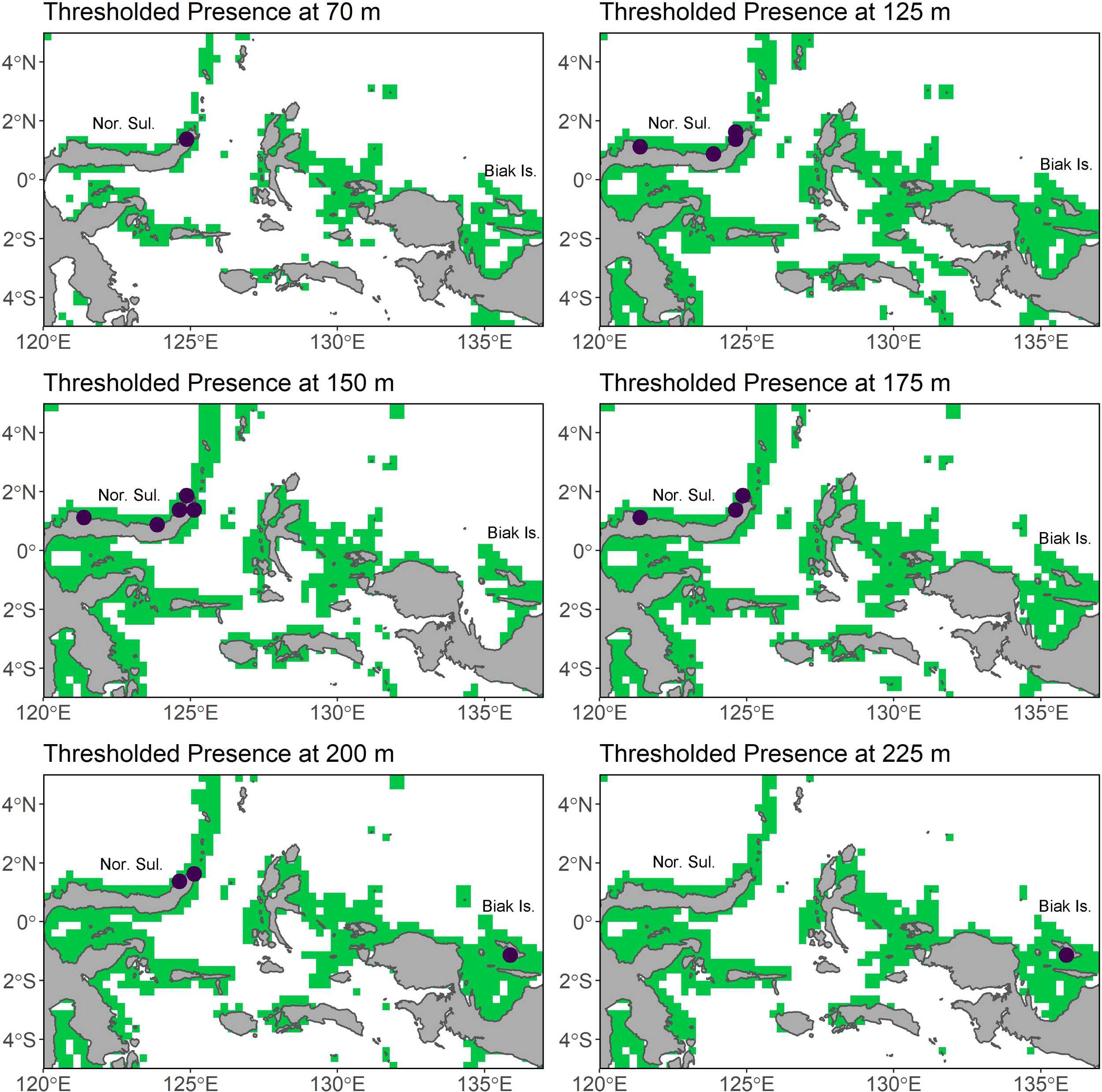 The thresholded 3D model projected into the Indo-Pacific focused over Sulawesi and Biak at each depth slice where an L. menadoensis occurrence has been recorded. Green indicates areas of predicted presence at the 0.8 sensitivity value, and the purple points are recorded L. menadoensis presences. Labels include abbreviations for Northern Sulawesi and Biak Island.