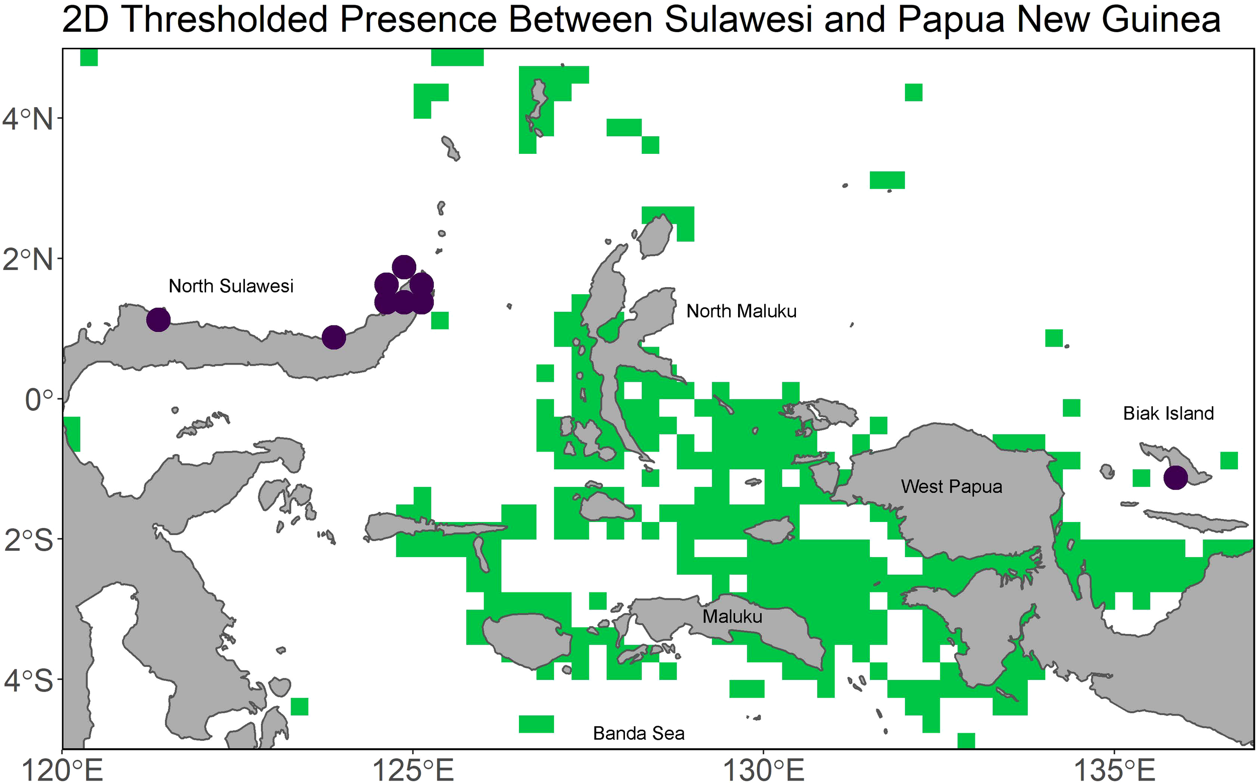 The 2D model projected into the Indo-Pacific and focused over Sulawesi and Biak island. Green indicates areas of predicted presence at the 0.95 sensitivity value, and the purple points are recorded L. menadoensis presences.