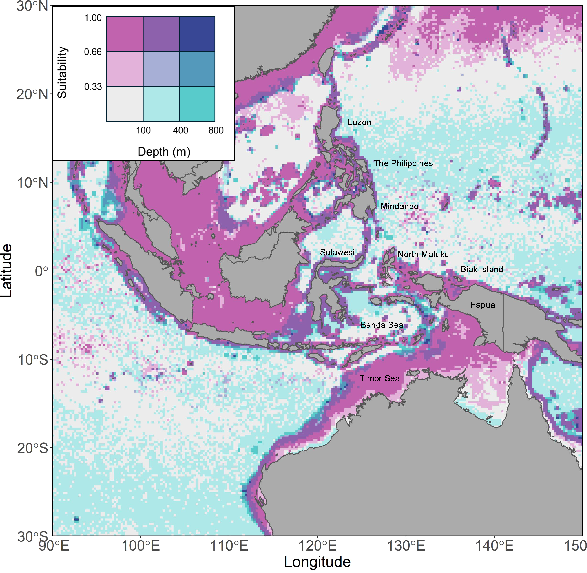 While the projected 3D model appears to predict suitable habitat in the surface waters of Southern China and Taiwan, this is likely due to the influence of cooler temperatures. It also predicts suitable habitat in the Gulf of Thailand, off the Southern coast of Vietnam, along the coasts of Indonesia, the Philippines, and Papua New Guinea, and off the Northwestern coast of Australia (Figure 6). The majority of this suitable habitat is between 100 and 400 m, with a notably high degree of suitability in the Philippines between 150 and 250 m. Thresholded plots of the 3D model projected over the Indo-Pacific on a per depth slice basis can be found on Figshare (10.6084/m9.figshare.28232735).