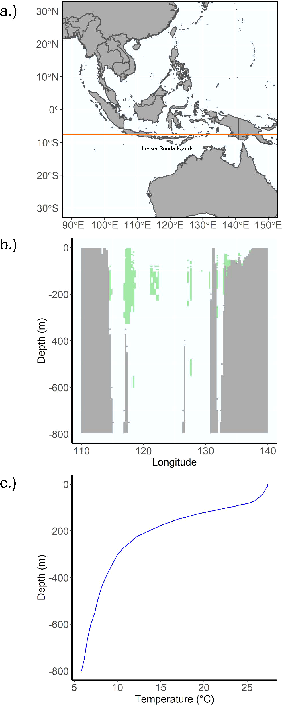 An example of L. chalumnae suitable habitat projected onto the Indo-Pacific. (A) is a map of the area of interest from Southeast Asia to Australia, where the orange line at latitude -7.625 corresponds to the following two plots. (B) depicts L. chalumnae suitable habitat by depth thresholded at the 0.8 sensitivity value in green, while grey corresponds to land or benthos. (C) is a plot of temperature by depth at a given longitude. The thermocline begins around 75 m, and suitable temperature conditions appear to drop off between 200 and 300 m, resulting in a shallower depth range than can be seen in the Comoros.