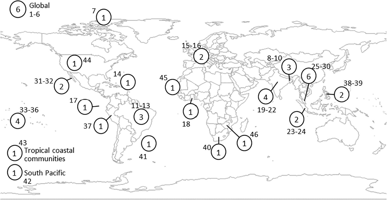 Overview of the geographical location and the amount of case studies in each location identifying climate adaptation strategies for SSFs (n = 46). Each location can be a specific place, country, or region, this is based on the scope of the literary articles reviewed. Numbers inside the circle note the number of literary articles for each location and the numbers outside the circle note the corresponding references of the articles. See Supplementary Table S1 for the corresponding list with references.