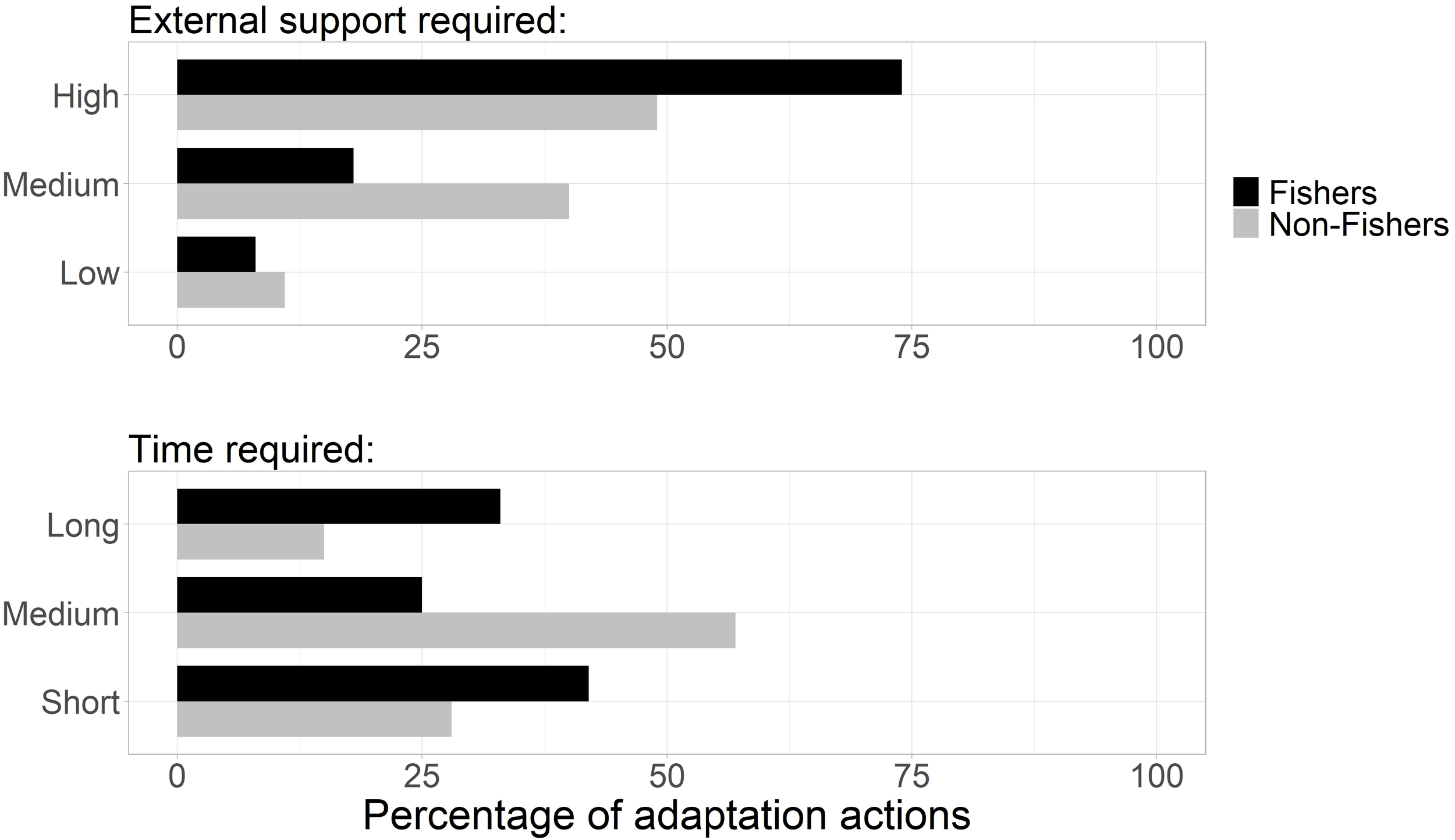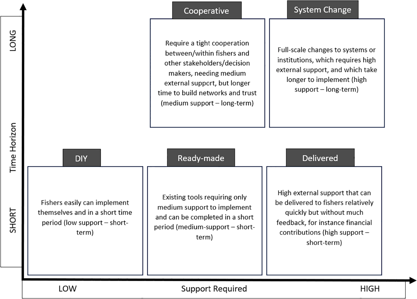 Fishers and fishing communities will need a high external help to implement those strategies since other people will have to make these changes for them. Changes in policies and regulations and decisions on funding can be short and long-term, depending on the institutions and decision-makers.
