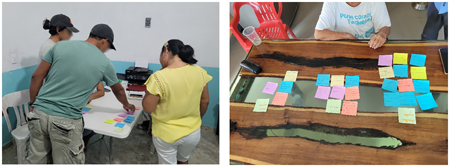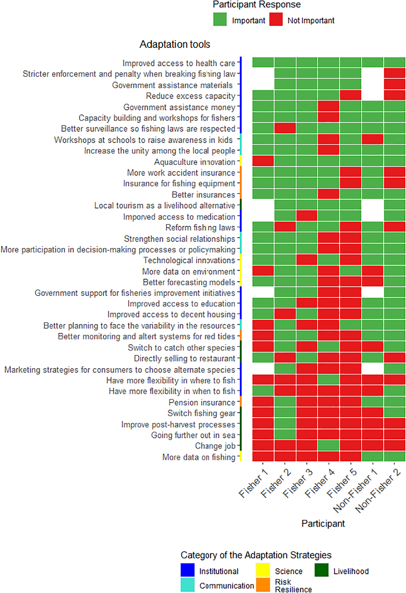 We applied this new framework to a case study of small-scale octopus fisheries in Yucatán, Mexico through an interactive exercise. The objective of this study was not to perform an in-depth analysis of the octopus fishers in Yucatán, but to assess the performance of the framework in the field and whether the time-support matrix was useful to understand the perspective of fishers themselves. The exercise was done in Spanish in group or individual, depending on the availability of the participants. Participants were invited through a local NGO COBI (Comunidad y Biodiversidad) with long-standing collaborations in the area. We had 5 groups of fishers with 5, 3, 3, 1, and 1 participant(s) respectively; and 2 groups of non-fishers of 1 and 2 participant(s) respectively, with people working in jobs related to the same fishing industry, but not as fishers themselves. We prepared a collection of sticky notes where we wrote down a condensed version of the adaptation tools from our framework, grouping similar tools together, and handed them over to the participant(s) (Figure 3). There were three rounds to the exercise: 1) the participant(s) had to go through all the sticky notes and identify which adaptation tools were important to them (important or not important), and add any tool or strategy that they thought was important, but was missing from the ones on the sticky notes, 2) from all the adaptation tools that they identified as being important, they now had to arrange those important ones into how much time they thought was necessary to implement each tool (scale 1-3, 1 = short time, 2 = medium time, 3 = long time), and 3) from those same important tools, they now had to arrange them according to how much external support they thought they needed to implement the tool (scale 1-3, 1 = little support, 2 = medium support, 3 = high support). When non-fishers were doing the exercise, they were asked to think about what adaptation tools they thought were important for the fishers and how much time or external support the fishers needed to implement the important ones.