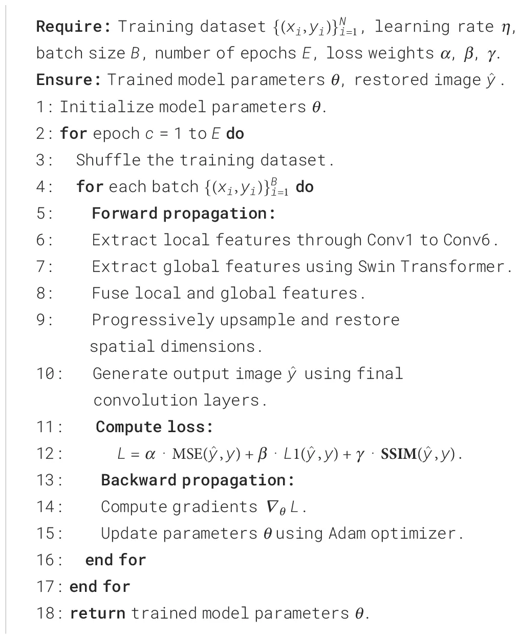Algorithm 1 Training procedure of the SwinCNet framework for underwater image restoration.