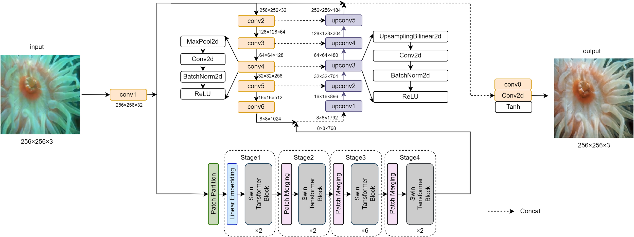 The proposed SwinCNet model in this study is a deep learning framework designed to address key challenges in underwater image restoration tasks, such as color distortion, reduced contrast, and blurred details. The model employs an innovative architecture that combines Convolutional Neural Networks (CNNs) and Swin Transformer V2 (Liu et al., 2022b) to leverage CNN’s capabilities in feature extraction and Swin Transformer’s advantages in handling long-distance dependencies. The framework diagram of the model we constructed, Figure 1, is shown below.