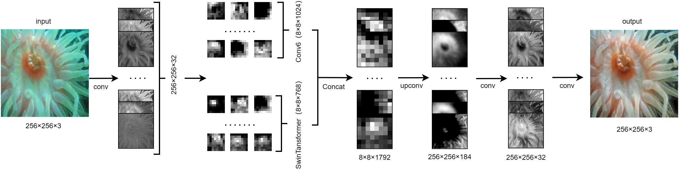 The feature maps resulting from the concatenation of conv6 and Swin Transformer (Liu et al., 2021) outputs showcase the fusion effects of local and global information. This fusion enhances the model’s overall understanding of the input image and improves the details and accuracy of the final output generated.