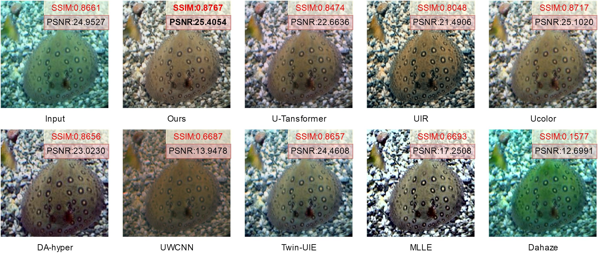 With the advancement of marine exploration, underwater imaging technology has become increasingly critical for scientific research and resource exploration. However, captured images frequently suffer from quality degradation caused by three primary factors: light attenuation, water scattering, and color distortion. These degradation effects significantly impair image analysis effectiveness, necessitating robust underwater image enhancement techniques to restore color fidelity and structural clarity.