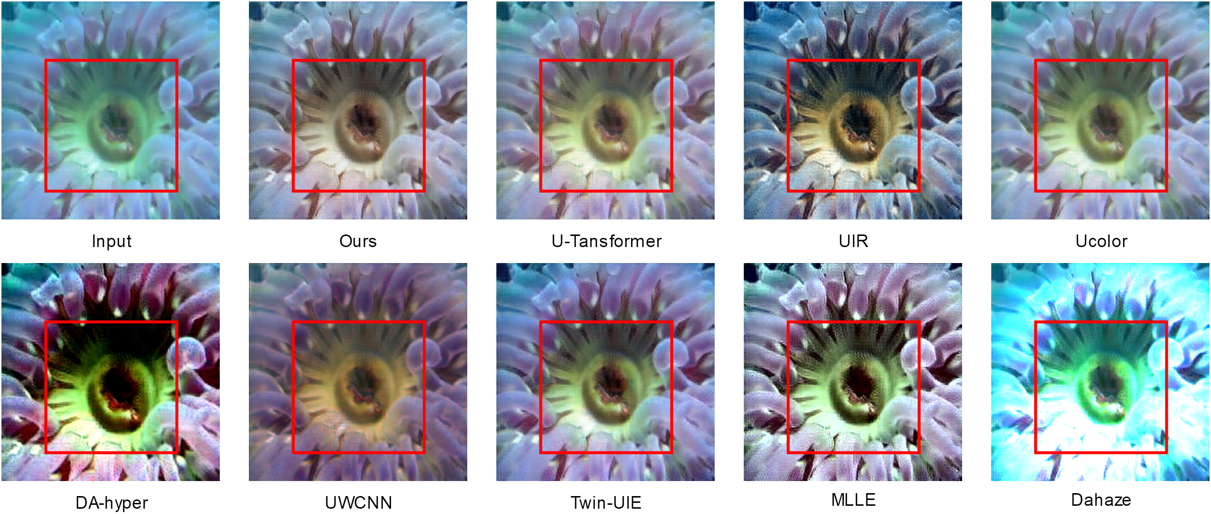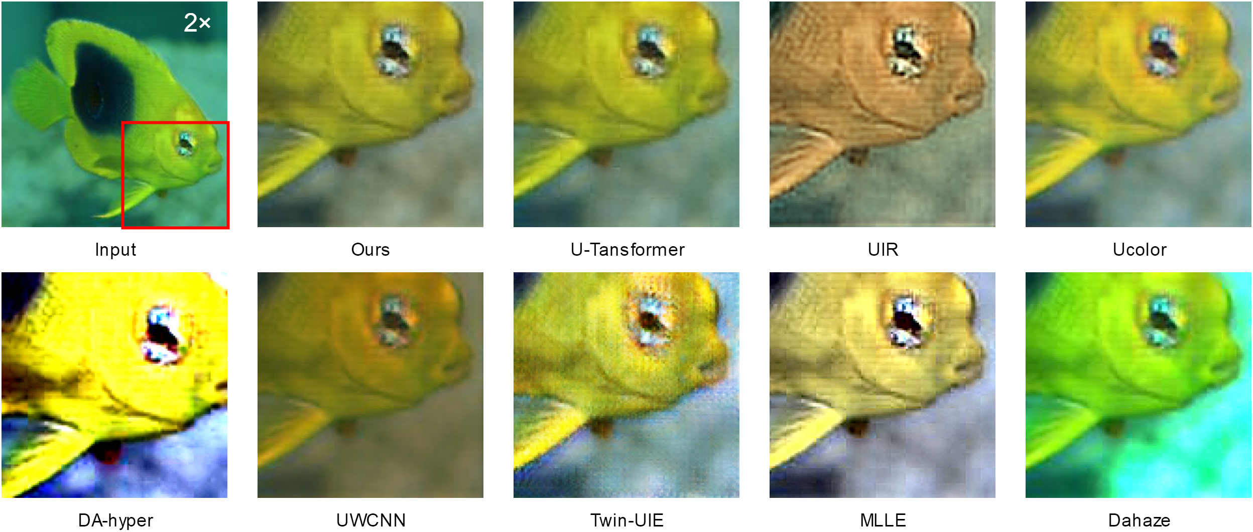 Figure 4 shows local comparisons with doubled pixel values. Traditional methods [UIR (Huang et al., 2023), MLLE (Zhang et al., 2022)] exhibit amplified noise artifacts, while learning-based approaches [UWCNN (Anwar et al., 2018), Twin-UIE (Liu et al., 2022a)] display color distortion. Although U-Transformer (Peng et al., 2023) maintains low noise levels, it retains residual green hues in background regions. In contrast, SwinCNet successfully removes unwanted green tones while preserving fine details in fish eye structures.