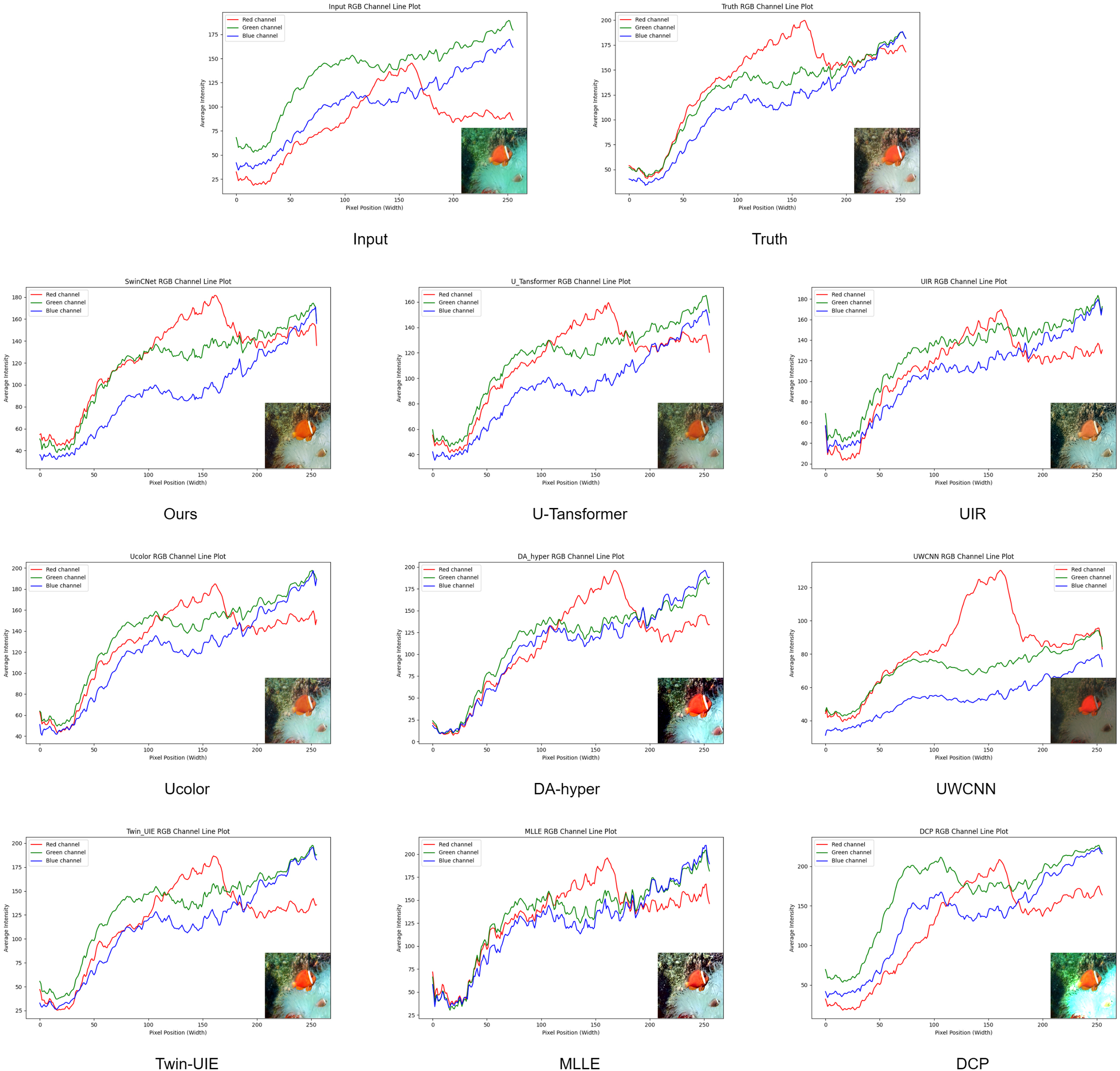 Experimental validation on the EUVP (Islam et al., 2020b) and LSUI (Peng et al., 2023) datasets demonstrates SwinCNet’s superior performance in underwater image restoration. The framework achieves significant improvements in both quantitative metrics and visual quality while maintaining computational efficiency critical for real-world applications.