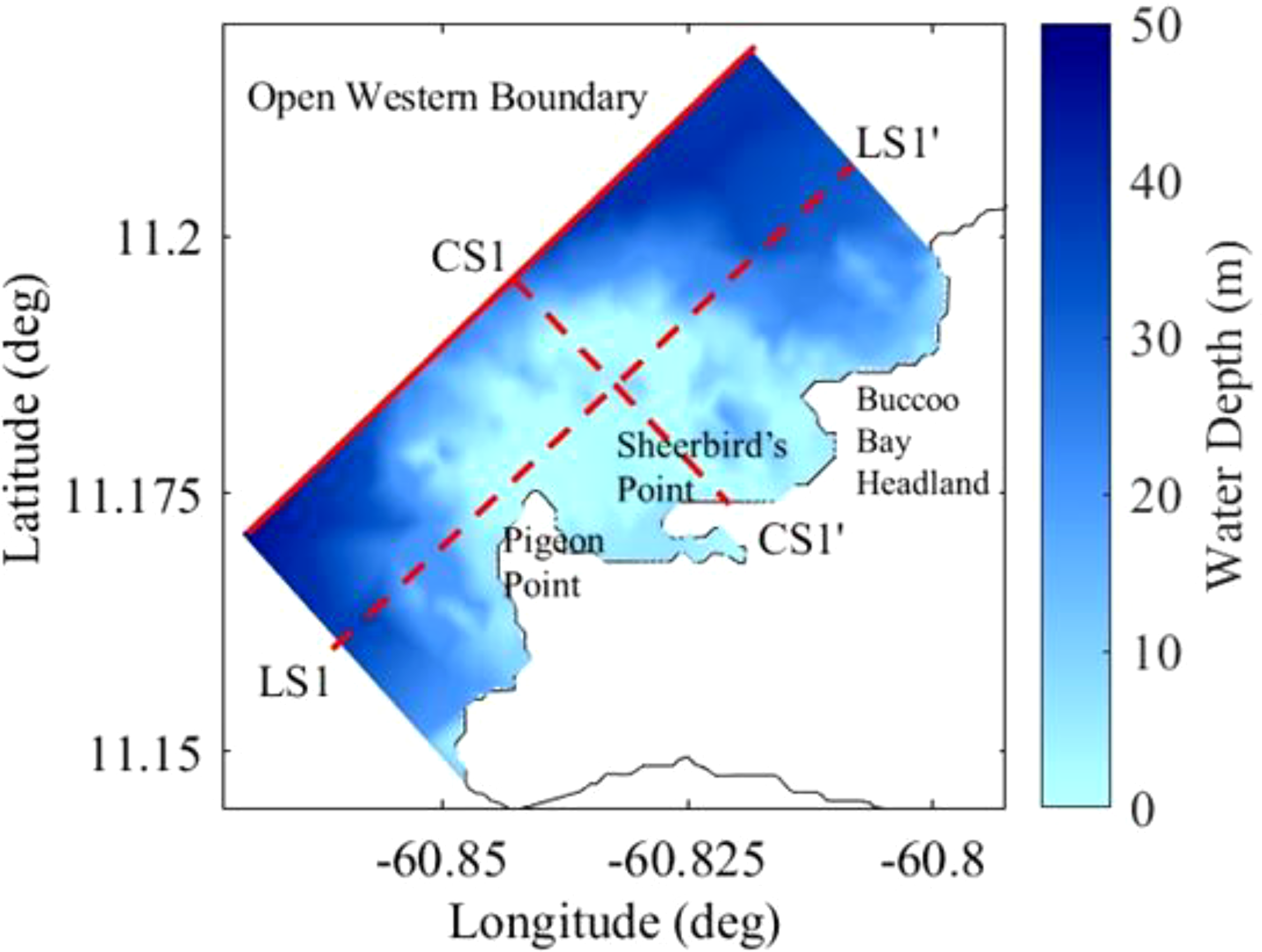 Model domain, interpolated bathymetry, open western boundary (red line) and cross-sections CS1-CS1’ and LS1-LS1’.