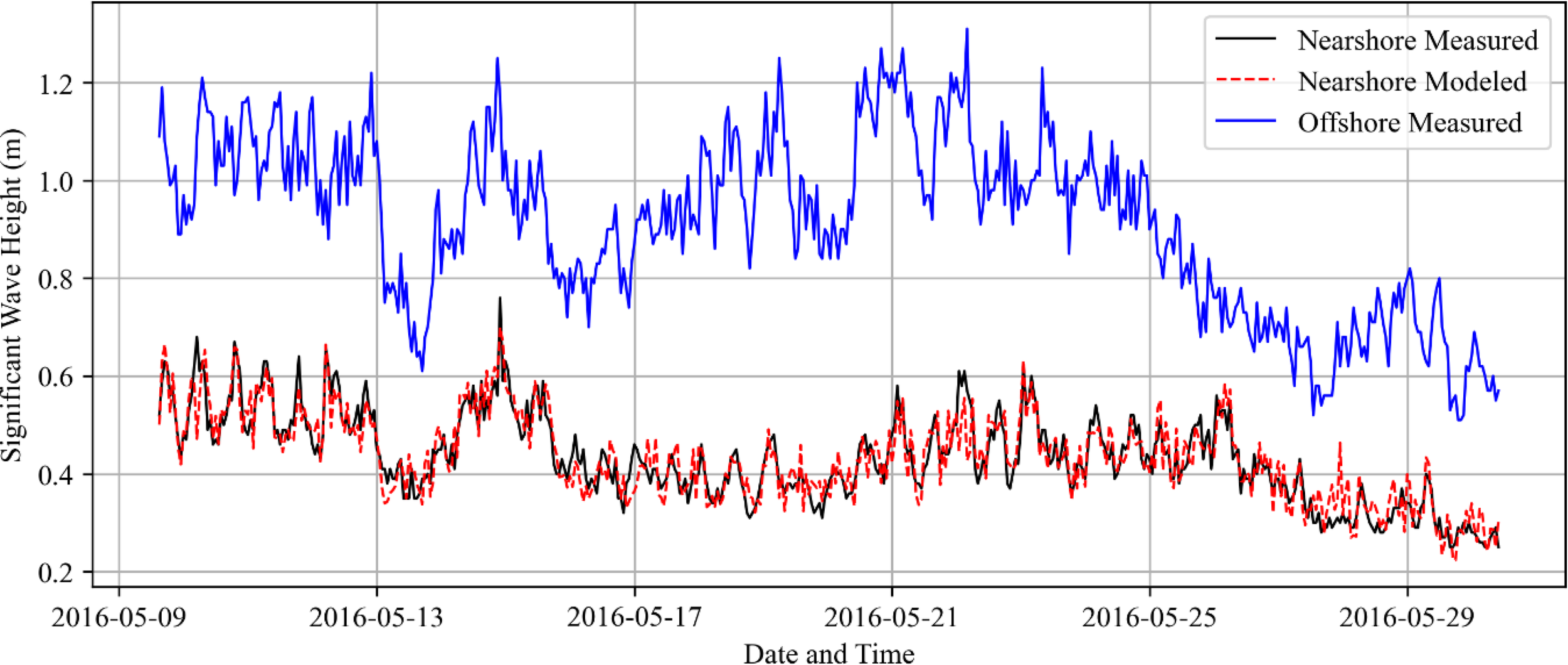 Nearshore measured and modeled water levels during the validation period of the model simulation.