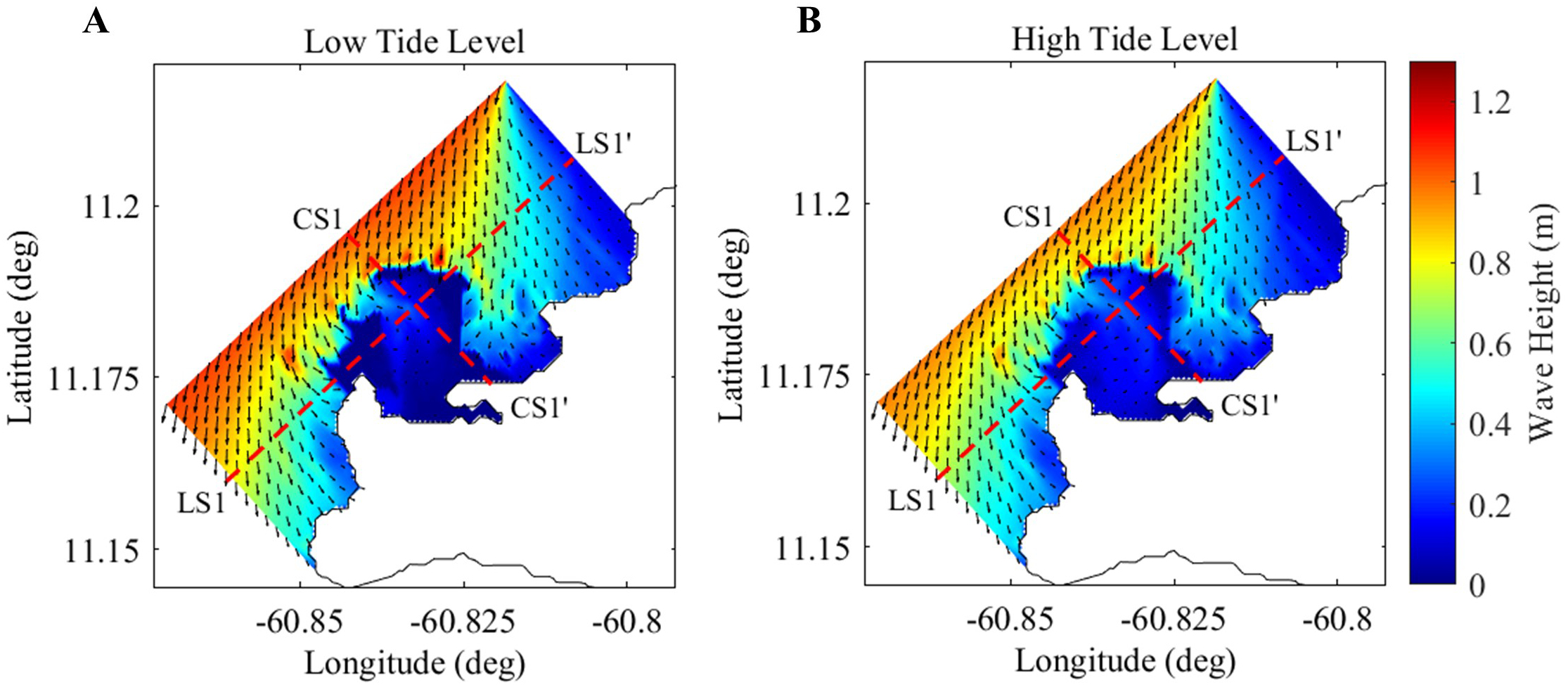 (A) Significant wave heights at low tide and high tide along cross-section LS1-LS1’ and (B) Water depths at low tide and high tide along cross-section LS1-LS1’.