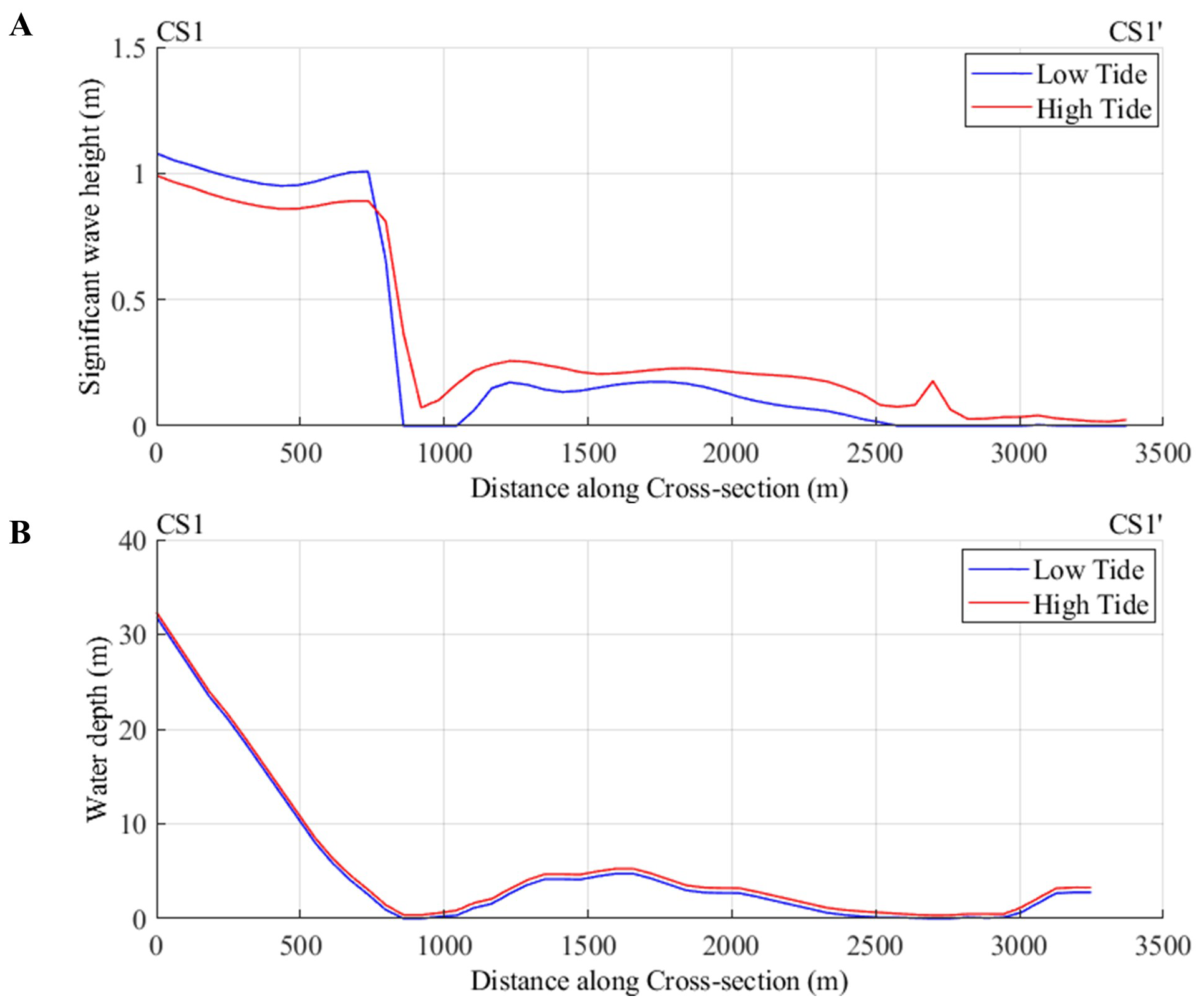 (A) Significant wave heights at low tide and high tide along cross-section CS1-CS1’ and (B) water depths at low tide and high tide along cross-section CS1-CS1’.