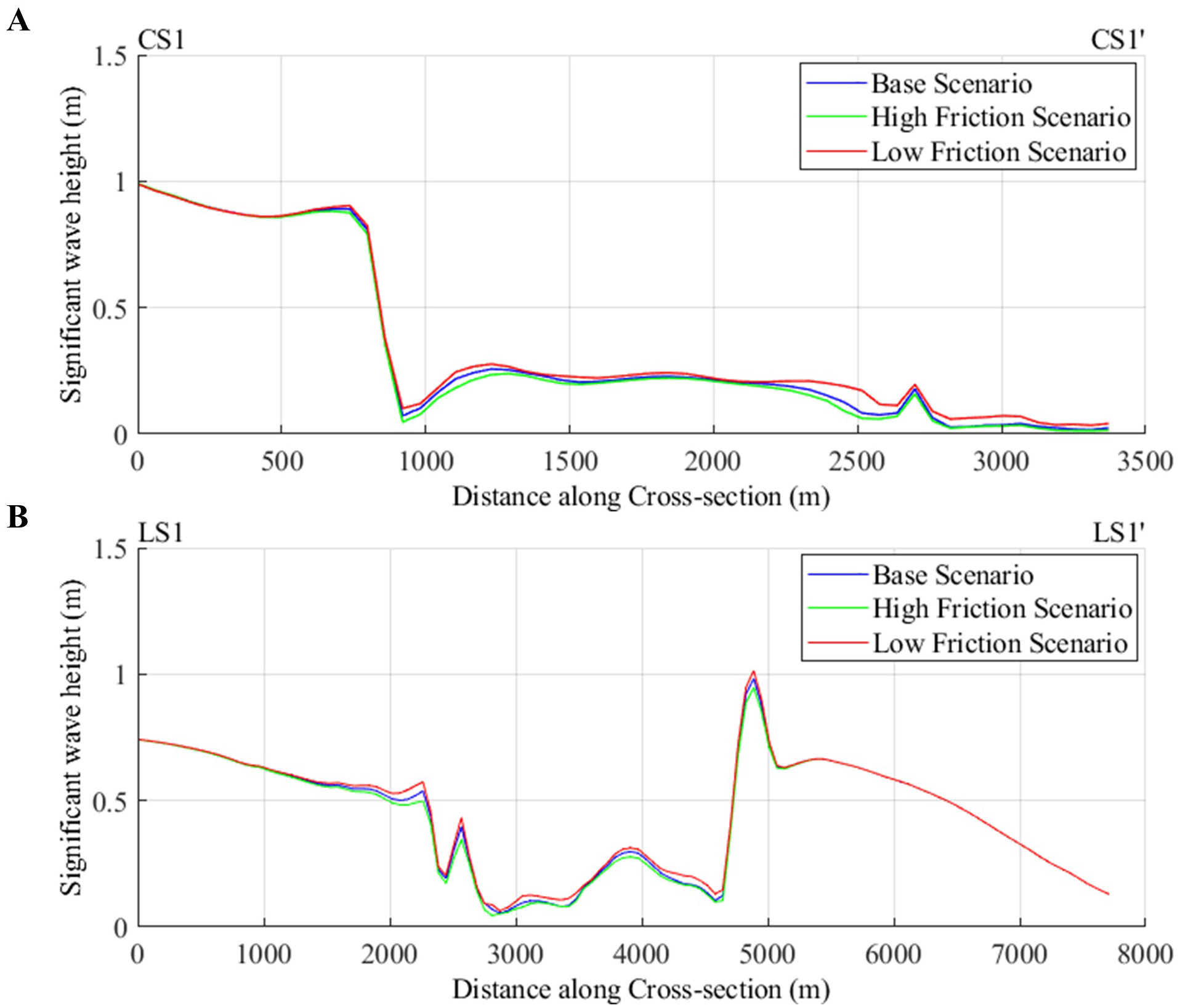 Significant wave heights under base scenario, low friction scenario and high friction scenario along (A) cross-section CS1-CS’ and (B) cross-section LS1-LS1’.