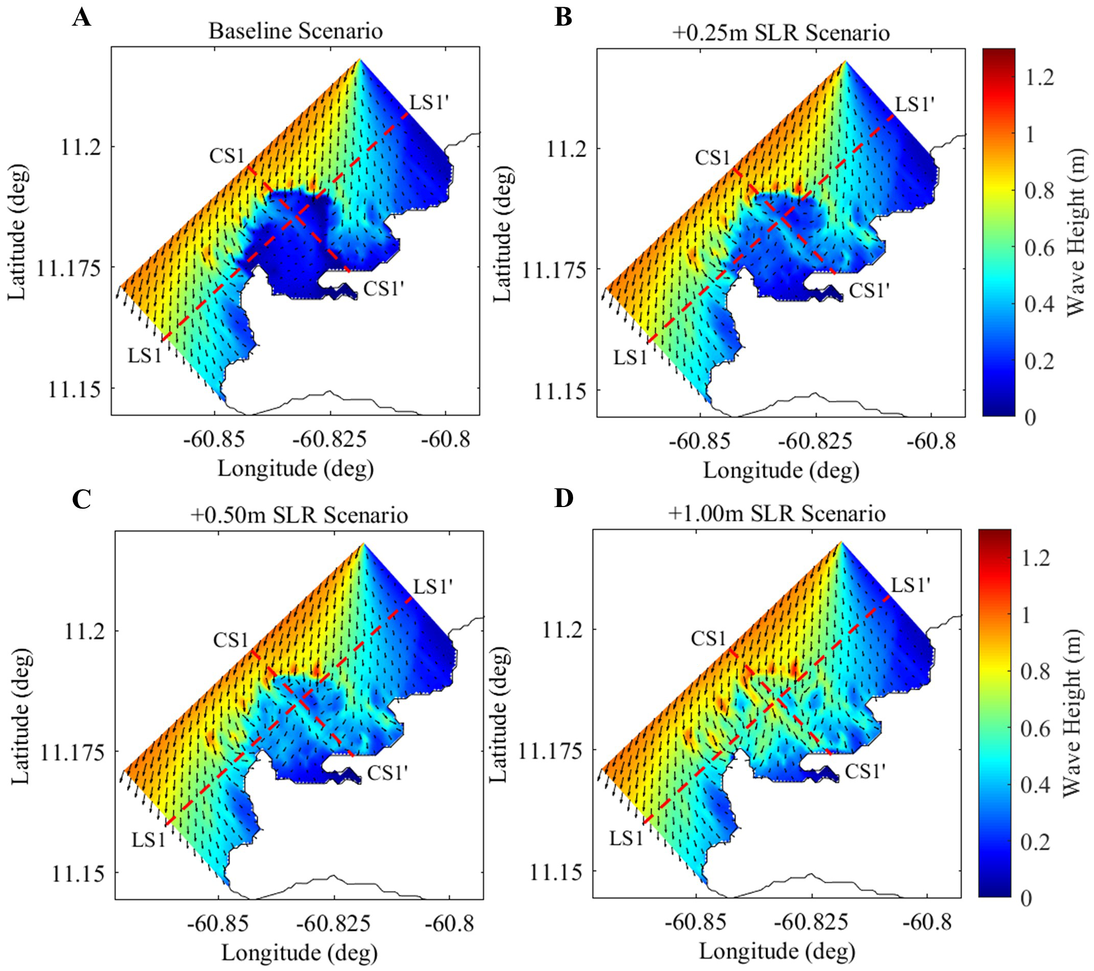 For the SLR Scenarios, the Neumann (1985) ‘Give-Up’ scenario was assumed, suggesting that coral reefs did not keep up with SLR. This assumption was reasonable since rates of accretion for exposed fringing reefs vary between 1-4mm year-1 (Buddemeier and Smith, 1988; Montaggioni, 2005). The SLR Scenarios show substantial increases in nearshore wave heights with an average increase in significant wave heights by 160.5% under the +0.25m SLR scenario, a 235.56% increase for the +0.50m SLR scenario, and a substantial 388.44% increase for the +1.00m. These increases in wave heights are a result of the decrease in depth-induced wave breaking taking place on the reef crest and frictional dissipation as sea level rises, with substantially higher wave heights in the nearshore area. The combination of coral reef degradation and SLR can lead to substantial increases in nearshore wave heights which can exacerbate existing coastal hazards such as coastal erosion and flooding and negatively impact coastal ecosystems and diminish the valuable ecosystem services that they provide.