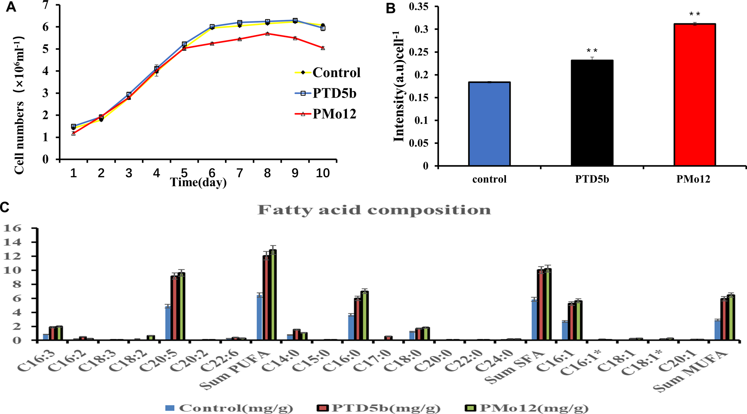 Growth and lipid analysis in diatom cells. (A) Growth curves of P. tricornutum. (B) Neutral lipid content of P. tricornutum. ** indicate extremely significant difference (p<0.01). (C) Fatty acid composition of P. tricornutum.