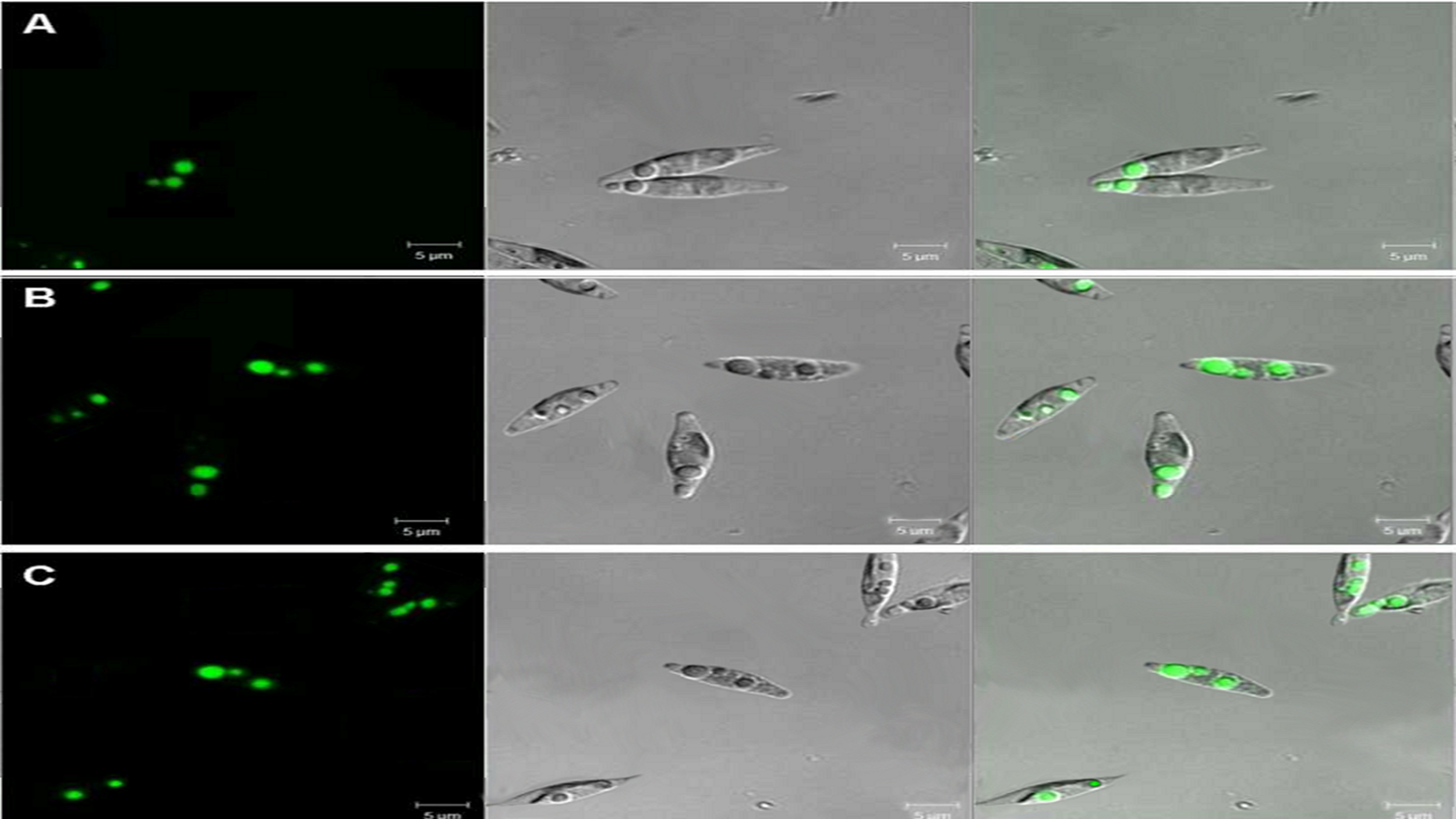 The confocal observation of Nile red-stained P. tricornutum cells. Part (A) indicates wild-type cells, part (B) indicates transgenic microalgae, part (C) indicates PMo12 (1 mol/L) added in the medium of microalgae. Left, red fluorescence of oil bodies; middle, differential interference contrast (DIC); right, overlay image. Bars = 5 μm.