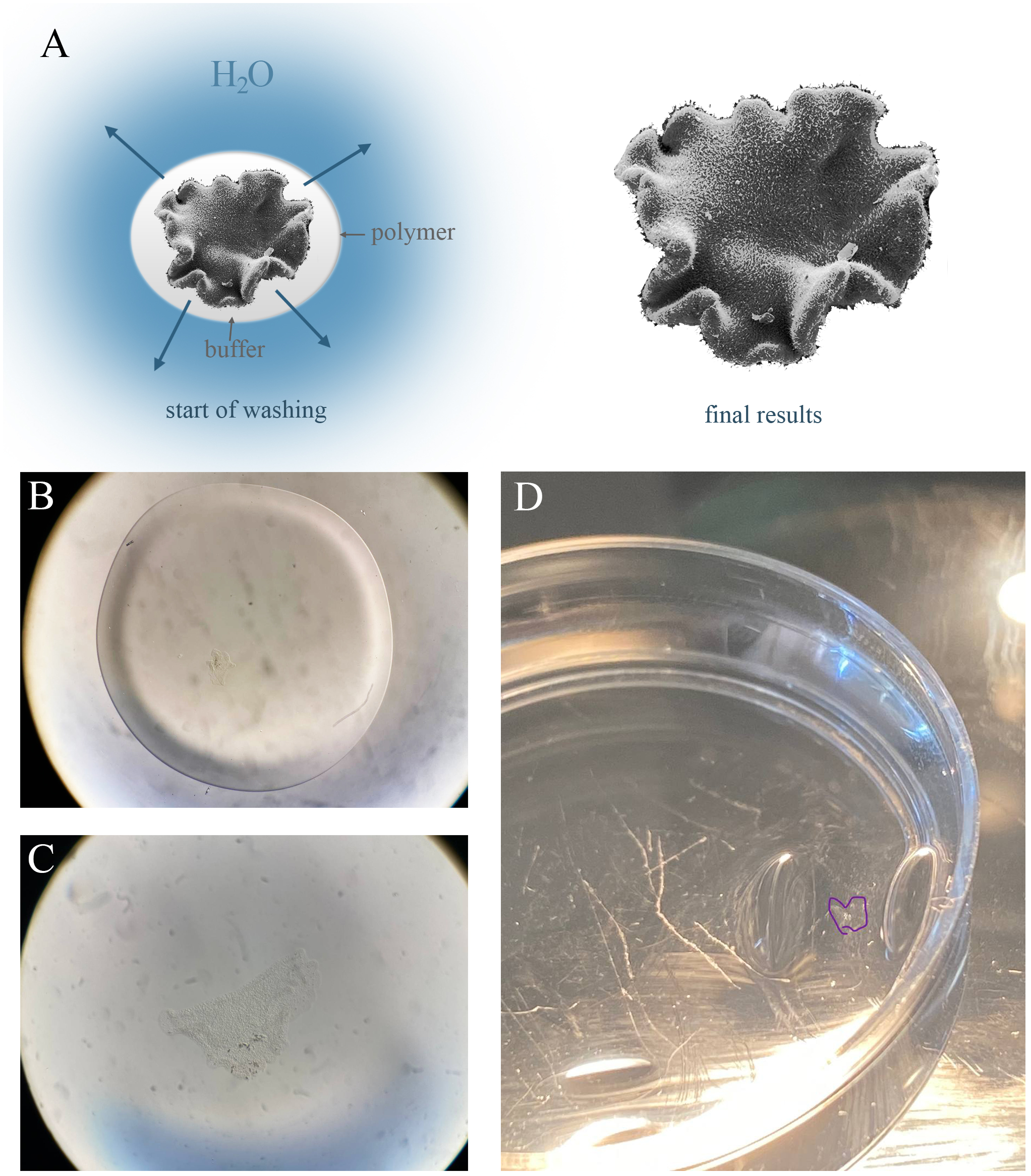 Expansion process during dialysis. (A) Scheme of dialysis of a biological object (Trichoplax) during dialysis. The animal was incorporated in a thin polymer (white color) with the buffer. At the start of dialysis individual has a control size. At the limit of hydrogel saturation and replacement of buffer with water molecules, the animal increases in size due to the stretching of cells. (B–D) Successive stages of hydrogel expansion: the start of washingpolymer (50 µL) with animal (B) to the intermediate stage with expansion sample (C). (B, C) – the same magnification. (D) The animal in the hydrogelis outlined in purple in a 35 mm Petri dish.