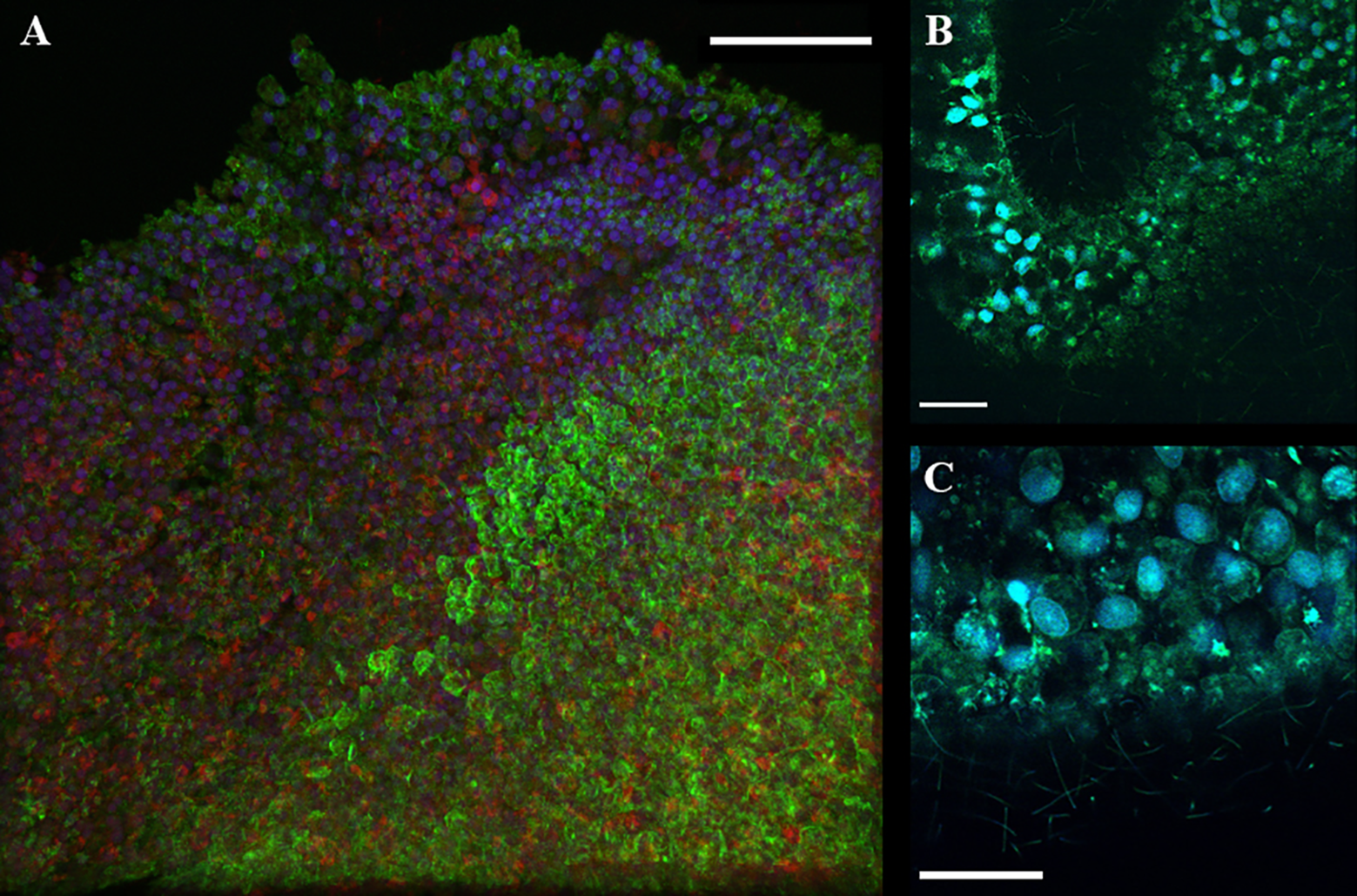 Confocal microscopy of ExM samples of T. adhaerens with a comparison of normal animal size. (A) Regular images on confocal microscopy with 60x objective focused on the rim area of epithelium. Staining with DAPI (blue), phalloidin (green) and mitotracker (red). (B, C) expansion microscopy with DAPI and acridine orange (blue and green channels with 40x objective) for the rim area of epithelial cells. Scale bar: (A–C) - 30 μm.