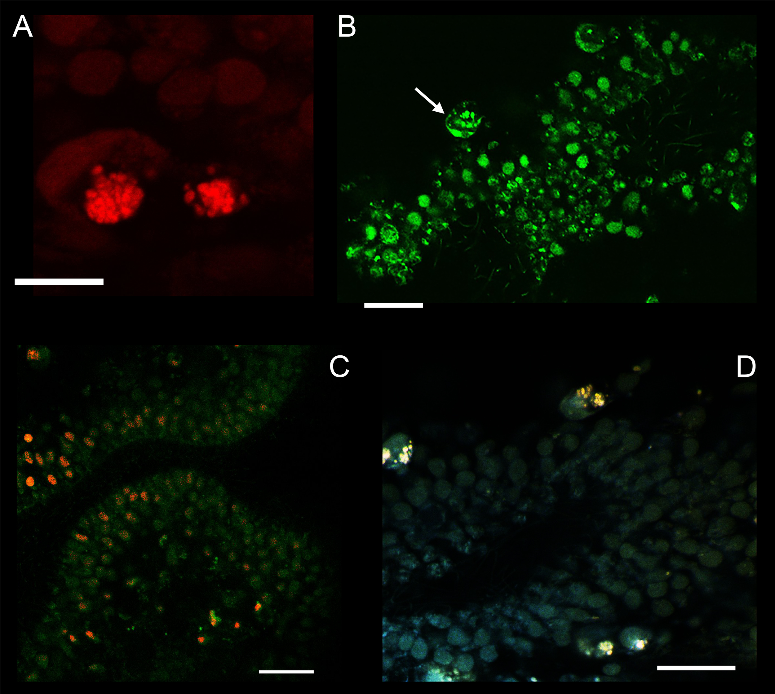 Confocal microscopy of ExM samples of T. adhaerens using acridine orange. (A) Two fiber cells with lysosomes in a red channel. (B) The same sample (as A section) in a green channel at different intracellular locations. (C) Colocalization of labeling (from green and red channels). AO in a green channel marked double-stranded DNA. In the red channel it revealed acidic lysosomes. (D) Colocalization of green and red channel signals for fiber cells: lysosomes have shown in green and red channels. Scale bar: (A) – 20 μm, (B–D) – 30 μm.