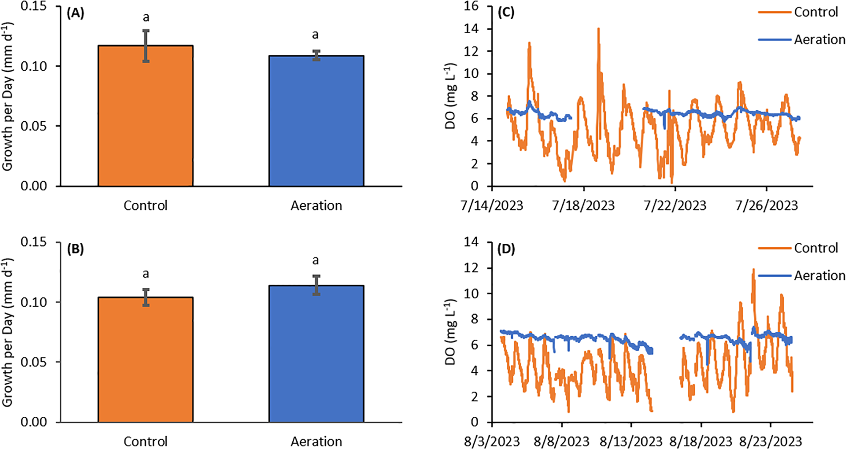 (A) Average daily growth over three weeks for the first hard clam (M. mercenaria) experiment. There was no significant difference in growth rates between the two treatments, however the Aerated treatment grew 7% slower. (B) Average daily growth over three weeks for the second hard clam experiment. There was no significant difference in growth rates between the two treatments, however the Aerated treatment grew 10% faster. (C) DO timeseries from the first experiment with missing data from the Aeration treatment was between 7/17 and 7/21. (D) DO timeseries from the second experiment with missing data from both treatments was between 8/14 and 8/16. Letter groupings represent statistical similarities and differences.