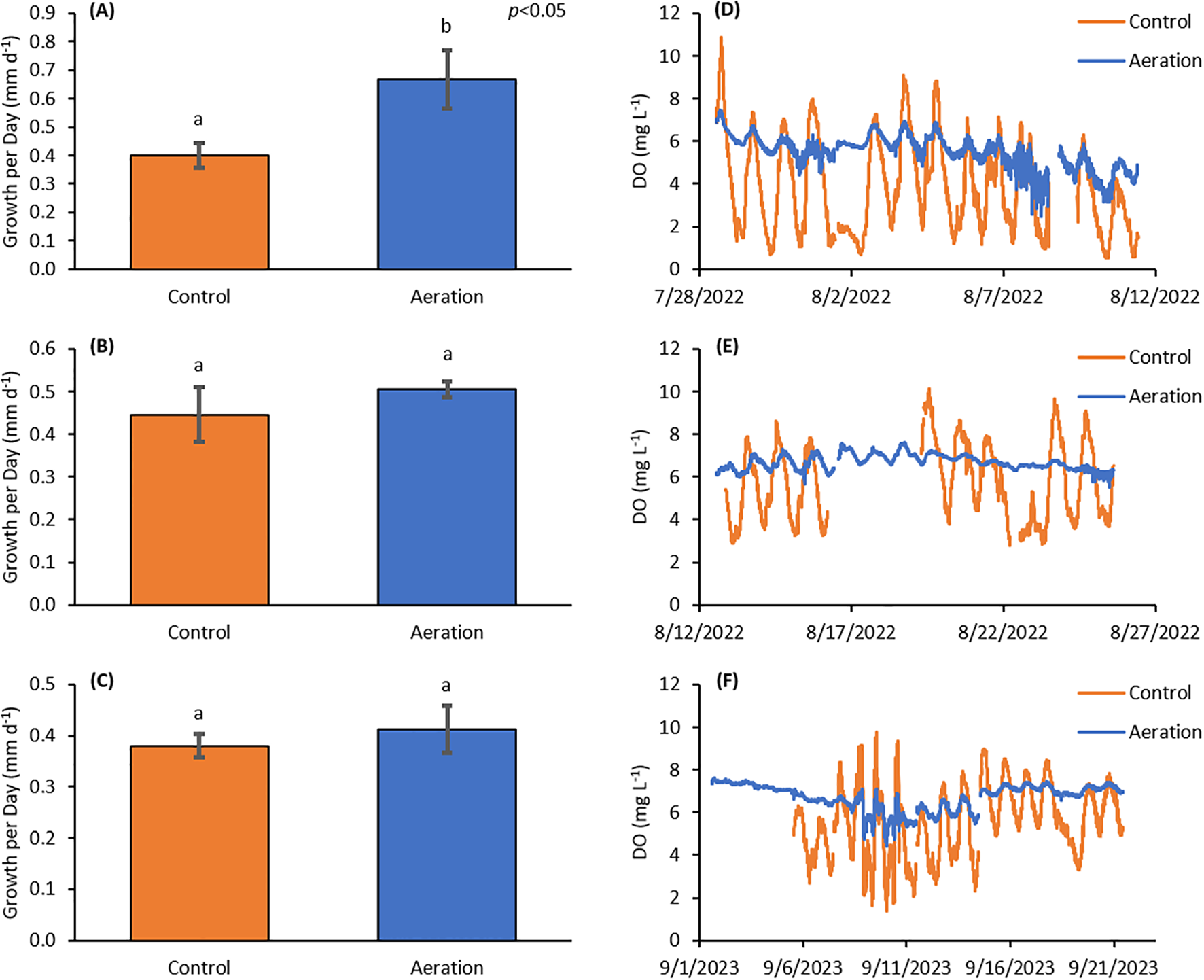Three experiments were completed with Eastern oysters in August of 2022, July 2023, and September 2023. The first two experiments persisted for two weeks with average starting shell heights of 15.5 ± 1.6 and 13.6 ± 1.4 mm (n=120) while the third experiment ran for three weeks with average starting height of oysters being 12.1 ± 1.4 mm (n=120). Mean temperatures for the experiments were 27.60 ± 1.14, 25.66 ± 1.39, and 24.19 ± 2.69°C. Average chlorophyll a levels were 29.2 ± 17.6 µg L-1, 34.9 ± 21.8 µg L-1, and 30.1 ± 39.1 µg L-1, respectively (Table 1). Mean nocturnal pH values were 7.61 ± 0.15, 7.72 ± 0.14, and 7.73 ± 0.18, respectively and mean nocturnal DO values during exposures were 3.82 ± 1.61, 4.85 ± 1.30, and 5.46 ± 1.55 mg L-1 in the unamended control and 5.43 ± 0.73, 6.71 ± 0.31, and 6.67 ± 0.64 in the aeration treatment, respectively (Figure 2). The first oyster experiment experienced on average 8.83 ± 4.87 hours of hypoxia (< 3 mg L-1) per day whereas there was 0.25 ± 0.53 h and 1.25 ± 2.12 h in the second and third experiments, respectively (Table 1). The first oyster experiment had growth rates of 0.667 ± 0.103 mm d-1 (n=3) in the aeration treatment, 67% and significantly higher than the unamended control which had a growth rate of 0.40 ± 0.042 mm d-1 (n=3) (p<0.05; Figure 2A). In the second experiment, the aeration treatment had a growth rate of 0.51 ± 0.019 mm d-1 (n=3) and the control grew 14% slower at 0.45 ± 0.064 mm d-1 (n=3) (p>0.05; Figure 2B). The third experiment had growth rates of 0.41 ± 0.045 mm d-1 in the aeration treatment with controls rates being 0.38 ± 0.023 mm d-1, with the aeration treatment growing 9% faster (p>0.05; Figure 2C).