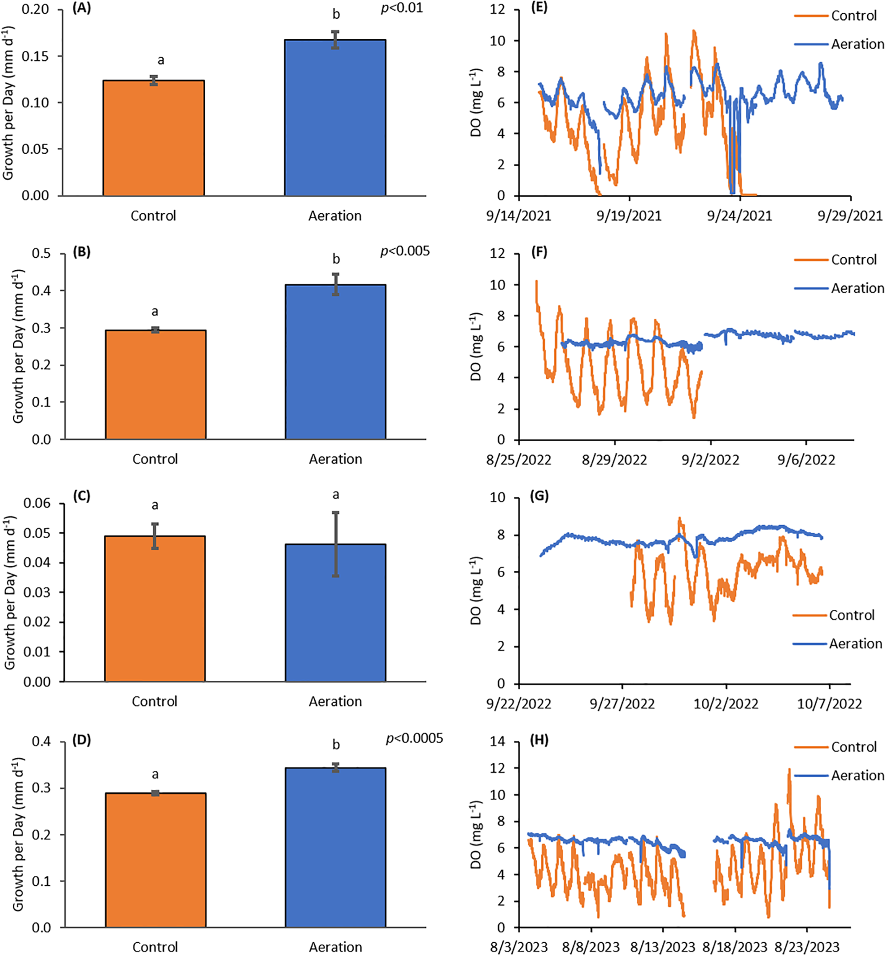 Four bay scallop experiments were completed in September 2021, August and September 2022, and August 2023. Experiments one and four ran for three weeks with average starting heights of 10.3 ± 1.7 and 12.3 ± 0.8 mm (n=120), respectively, while experiments two and three ran for two weeks with average starting heights of 13.0 ± 0.8 and 13.3 ± 0.6 mm (n=120), respectively. Mean temperatures for the experiments were 23.54 ± 0.82, 26.29 ± 1.70, 17.21 ± 2.33, and 24.69 ± 1.18°C and nocturnal pH values of 7.78 ± 0.22, 7.72 ± 0.12, 7.65 ± 0.12, and 7.67 ± 0.12, in experimental order. Average chlorophyll a levels were 55.5 ± 71.9 µg L-1, 26.1 ± 20.4 µg L-1, 4.34 ± 7.63 µg L-1, and 22.9 ± 15.2 µg L-1, respectively (Table 1). Mean nocturnal DO values for these experiments were 5.00 ± 2.65, 4.87 ± 1.44, 6.13 ± 1.05, and 4.52 ± 1.48 in the unamended controls and 6.61 ± 0.98, 6.52 ± 0.30, 7.81 ± 0.34, and 6.54 ± 0.30 in the aeration treatment, in experimental order (Figure 3). The scallop experiments experienced an average 6.90 h, 5.65 h, 0.00 h, and 4.82 h of nocturnal hypoxia in the respectively (Table 1). The first bay scallop experiment had growth rates of 0.17 ± 0.0088 mm d-1 (n=3) in the aeration treatment, 35% and significantly faster than the unamended control (0.12 ± 0.0042 mm d-1 (n=3); p<0.01; Figure 3A). In the second experiment, the aeration treatment had a growth rate of 0.42 ± 0.027 mm d-1 and the control had 0.29 ± 0.0060 mm d-1 (n=3), with the aeration treatment growing significantly faster by 41% (p<0.005; Figure 3B). During the third experiment, scallops had growth rates of 0.046 ± 0.011 mm d-1 in the aeration treatment growing 5% slower than the control at 0.049 ± 0.0042 mm d-1 (n=3) (Figure 3C). Finally, in the fourth experiment, scallops had growth rates of 0.34 ± 0.0082 mm d-1 in the aeration treatment and 0.29 ± 0.0040 mm d-1 (n=3) in the control, with the aeration treatment growing 19% and significantly faster (p<0.0005; Figure 3D).