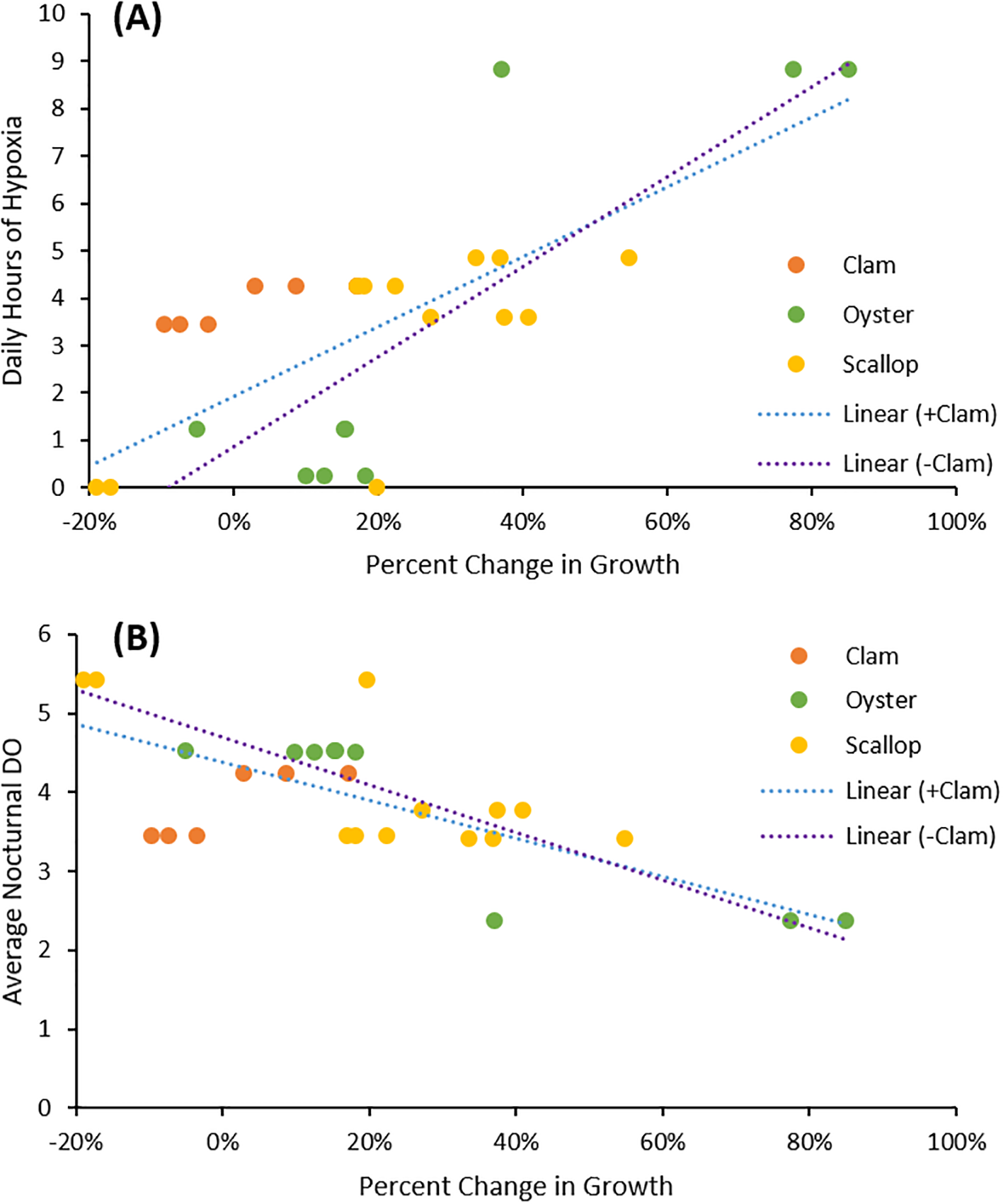 (A) Linear regression with a significant correlation between change in growth rates and daily hours of hypoxia (p<0.0001 with clam included; p<0.00001 with clams excluded). The total hours of hypoxia observed were normalized by the duration of the experiment to yield daily hours of hypoxia. (B) Linear regression with a significant negative correlation between change in growth rates and average nocturnal DO (p<0.0001 with clam included; p<0.00001 with clams excluded). Nocturnal DO values were averaged from 30 minutes after sunset to 30 minutes before sunrise.