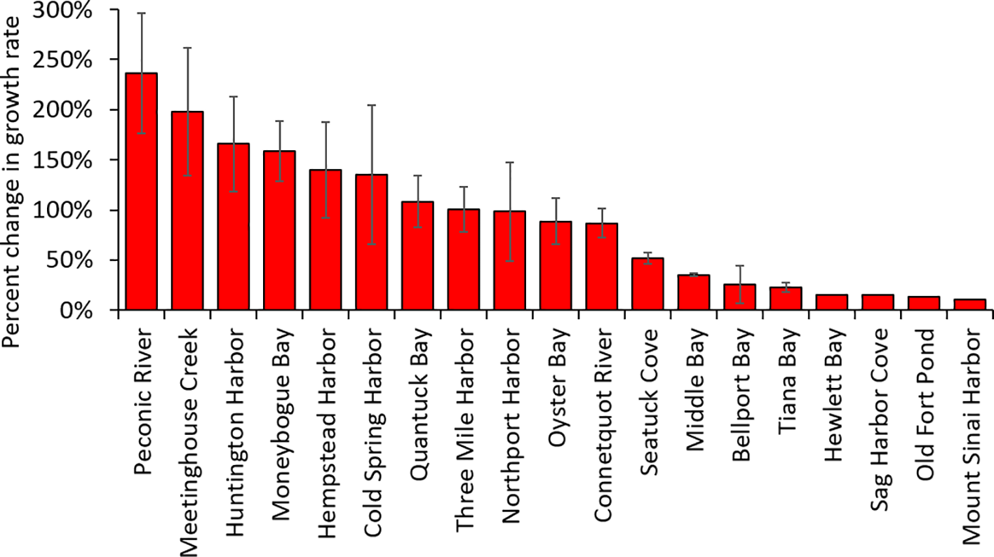 Potential increase in bivalve growth rate with aeration at 18 locations using regressions from Figure 4. Bars represent the mean of the two projected changes based on the regressions in Figures 4A, B and the error bars are standard error (SE). Details of the locations and DO data appear in Supplementary Table 1; Supplementary Figure 3.