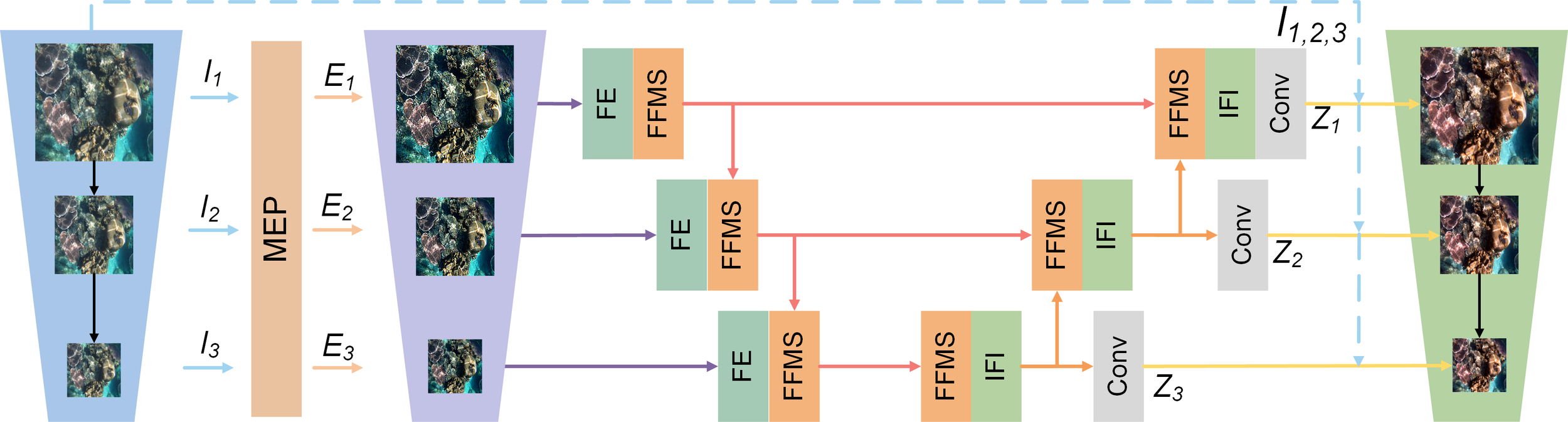 MUFFNet structure. The image is scaled to produce I1, I2, and I3. Then enhanced images E1, E2, and E3 are generated by the MEP, which is input into the sub-network for feature extraction, generating the final enhanced images Z1, Z2, and Z3.