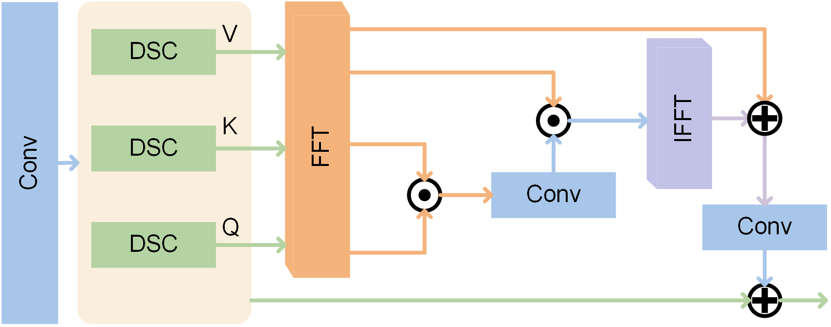 FFMS structure. The features pass through the DSC to obtain Q, K, and V, followed by Fourier variation for frequency domain feature extraction. Finally, the residual block obtains the feature frequency domain information.