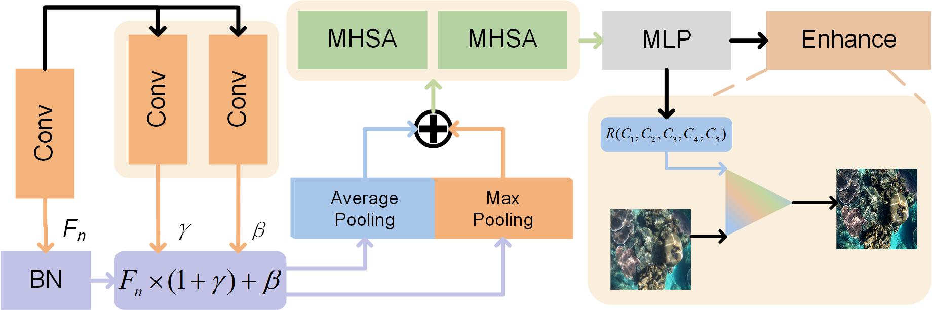 Notably, the aforementioned enhancement algorithms are differentiable, allowing parameters to be optimized via gradient descent. Therefore, we design an adaptively learnable enhancement network to adjust dynamically augmentation parameters confronting different underwater environments. The network structure is shown in Figure 4. Initial image features are extracted to obtain shallow features, which are then dynamically normalized using Conditional Normalization (CN) to enhance the network’s representation capabilities. Remarkably, the CN is widely employed in generative models, which emerged with an exciting performance in generation tasks, including style transfer and super-resolution. Hence, we expect MEP with CN to modulate the relative spatial distribution based on the current image state to obtain optimal enhancement parameters.