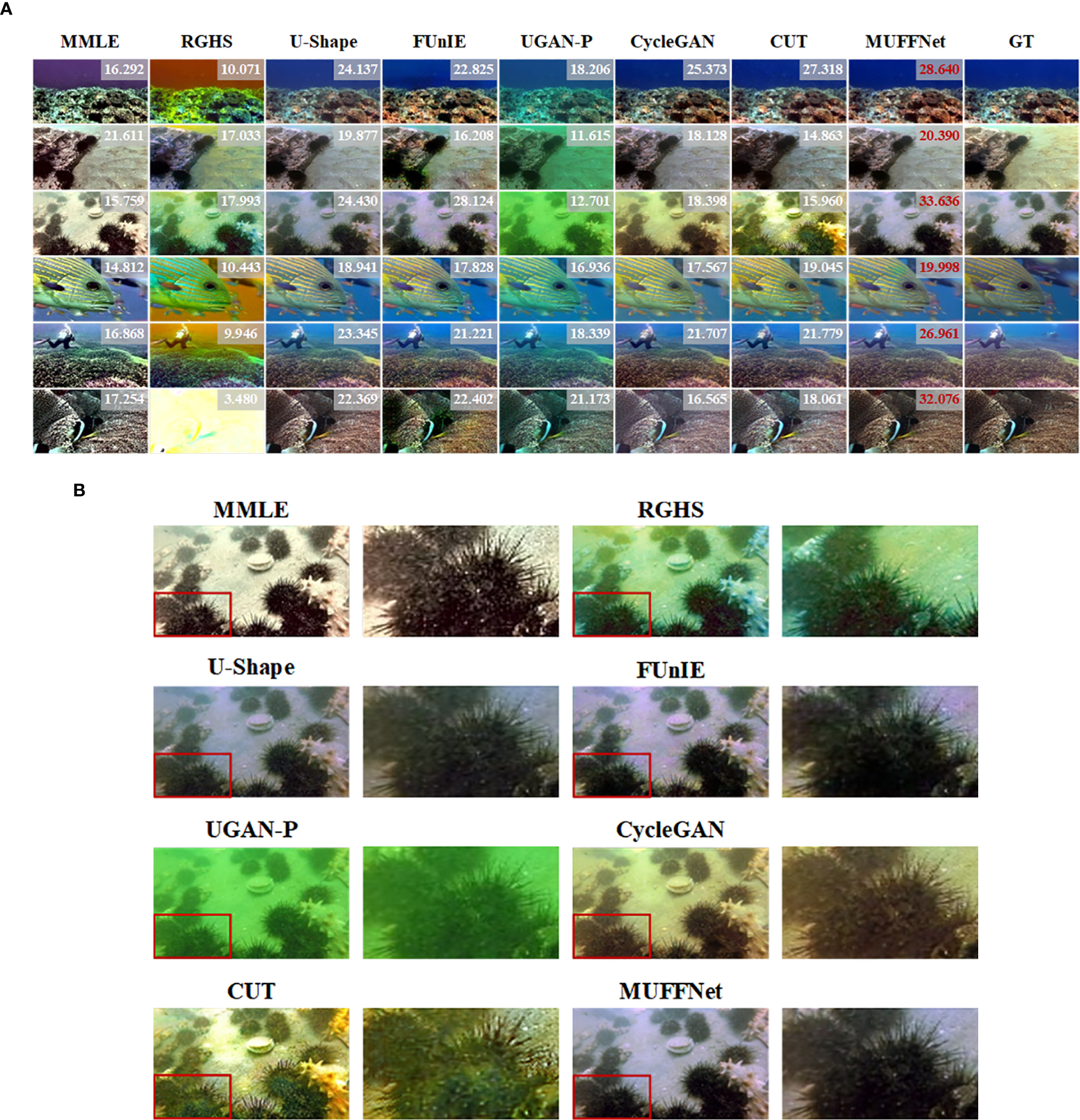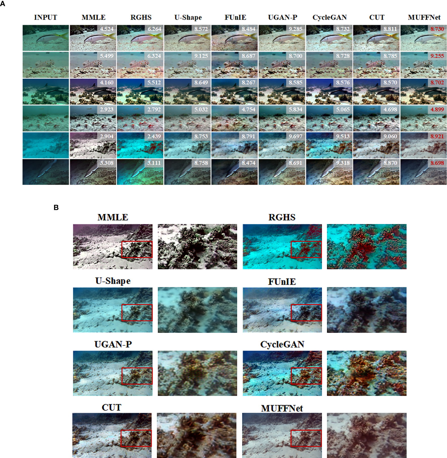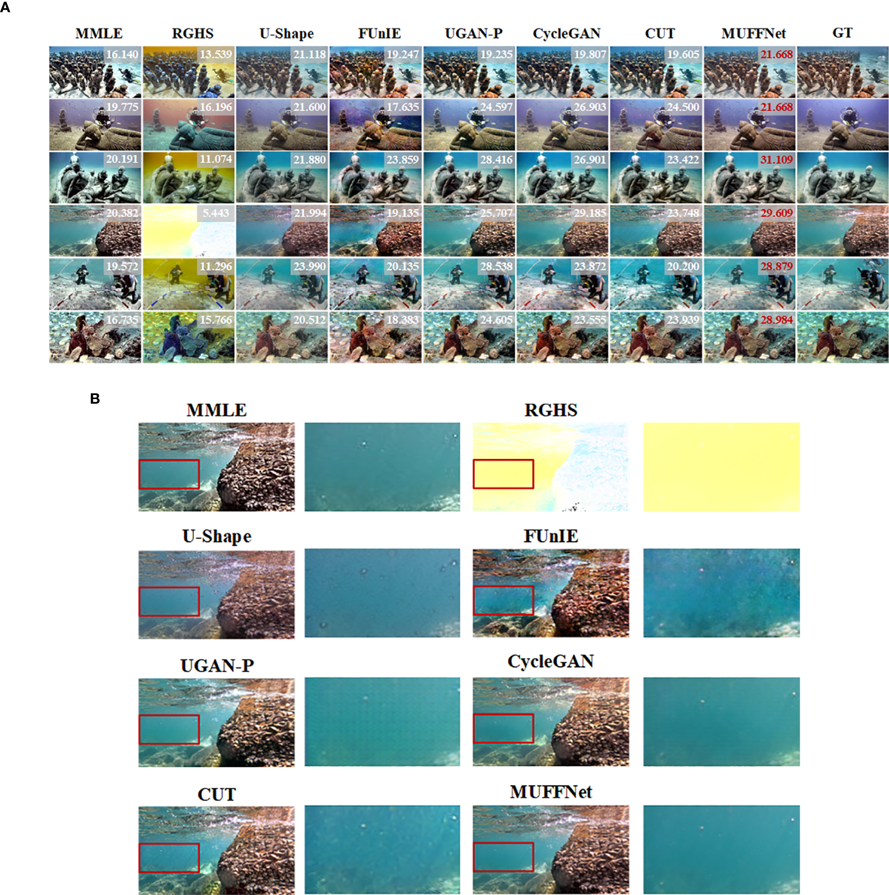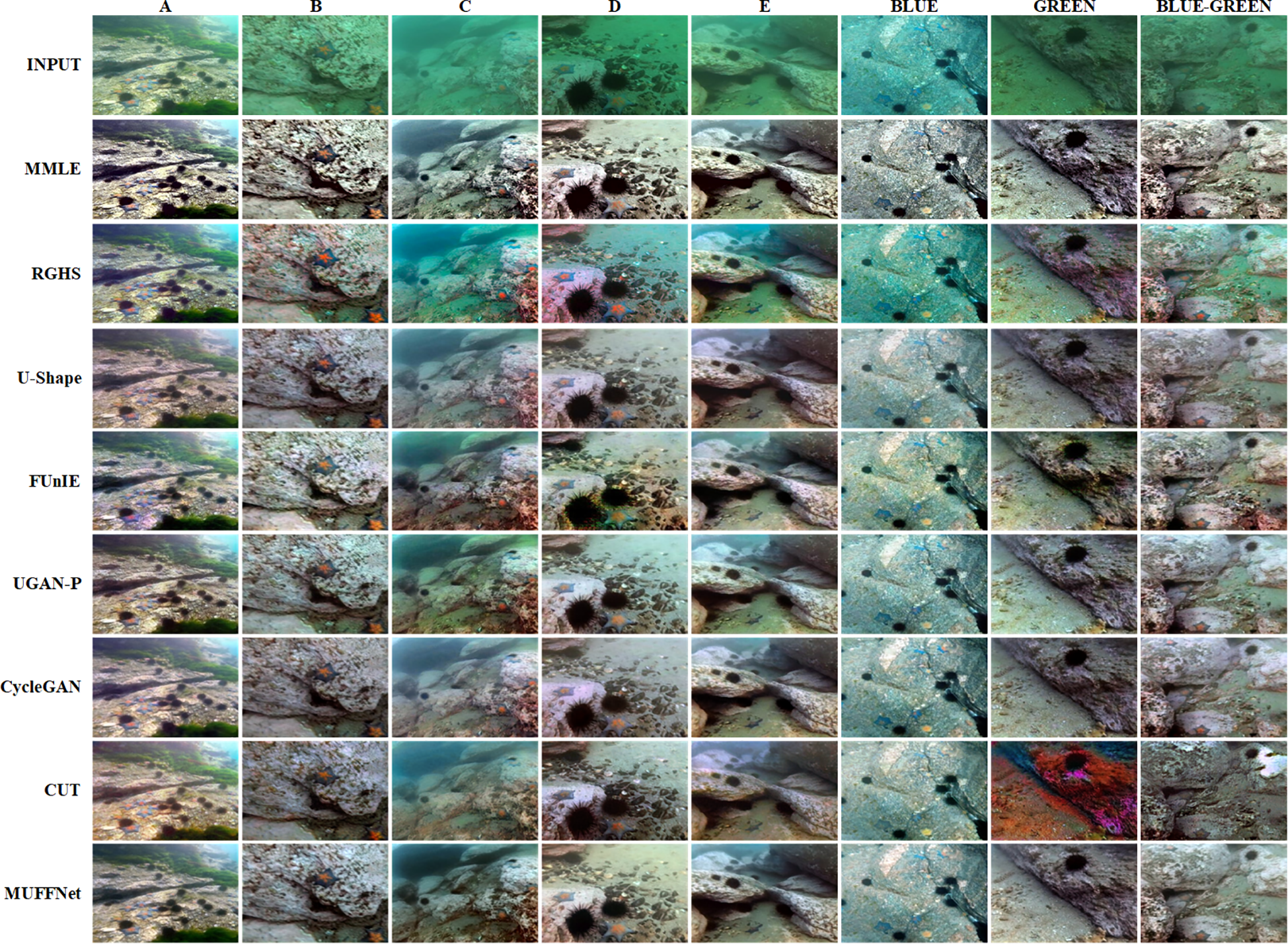 To comprehensively evaluate the effectiveness of MUFFNet in UIE, we value its effectiveness on various datasets, including the renowned UIEB and the refined LUSI. LUSI contains 4,279 images selected elaborately from diverse public underwater datasets, which exhibit high quality and generalization Peng et al. (2023). MUFFNet is trained mainly using LSUI, divided into 2,996 images for training, 856 for testing, and 430 for validation. UIEB, divided into 624 images for training and 179 for validation, evaluates the robustness and expression capabilities of MUFFNet, which possesses more noise and low-quality images. In addition, 60 challenging no-reference images and the RUIE dataset were further compared with SOTA methods, validating the MUFFNet performance in different underwater scenes.
