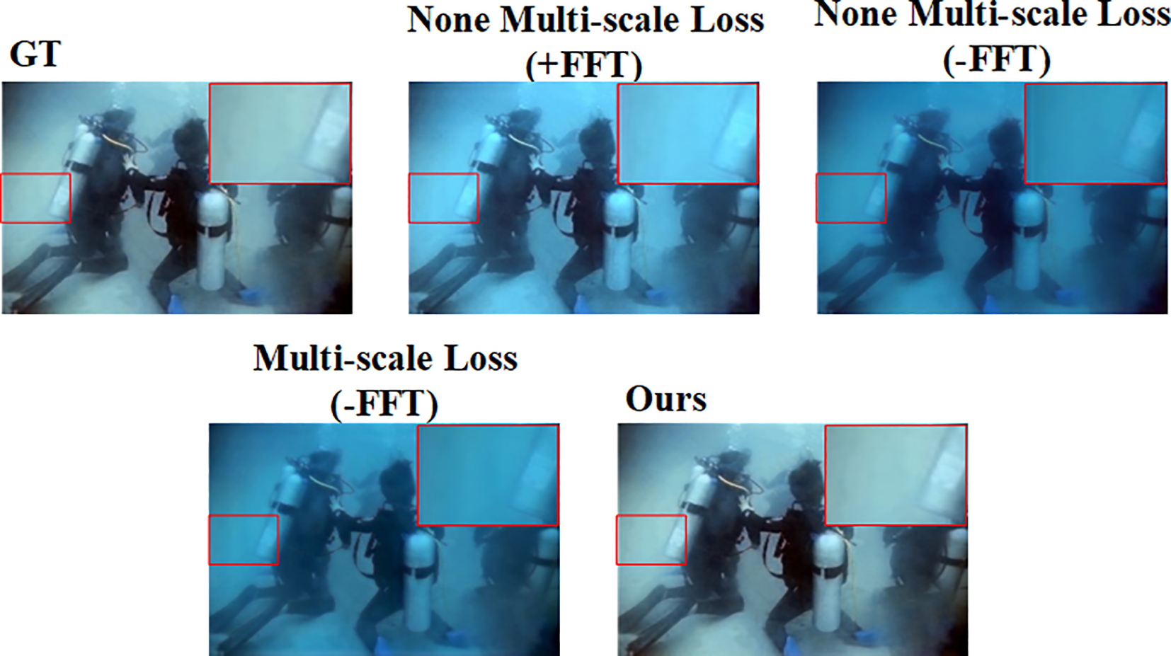 Furthermore, adding an auxiliary loss can further improve the network optimization and performance, facilitating the gradient flow and encouraging the network to learn more valuable information from various stages of the UIE. Therefore, the article primarily utilizes frequency domain feature extraction as the network core, and the addition of frequency domain loss corresponds to the network, enhancing the network’s performance and efficiency in frequency domain extraction. The frequency domain loss is defined as follows.