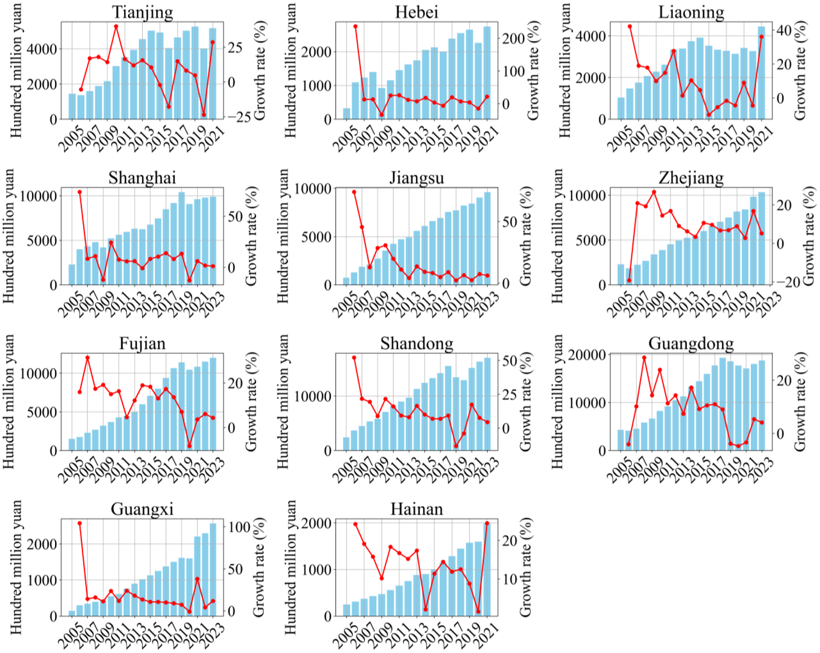 This study compiles Gross ocean product data from the coastal provinces of China, as shown in Figure 2. The data sources include the China Marine Statistical Yearbook and the Marine economy statistical bulletins published by the provincial natural resources (marine) administrative departments and statistical agencies. The data sets begin at 2005, but the most recent data varies between provinces due to data availability. For example, gross ocean product data for some provinces, such as Shandong, is available up to 2023, whereas for others, like Hebei, it only extends to 2021.