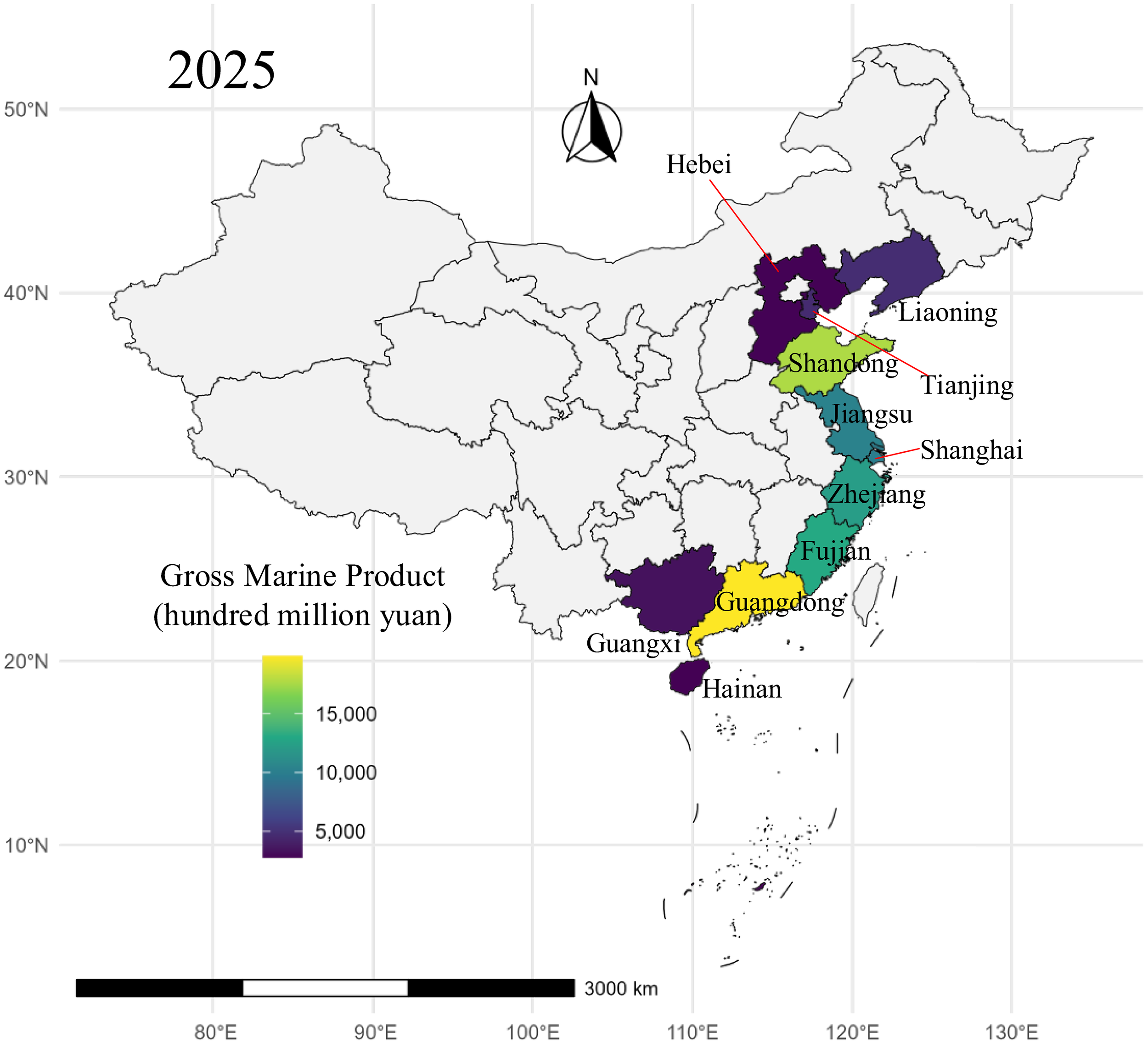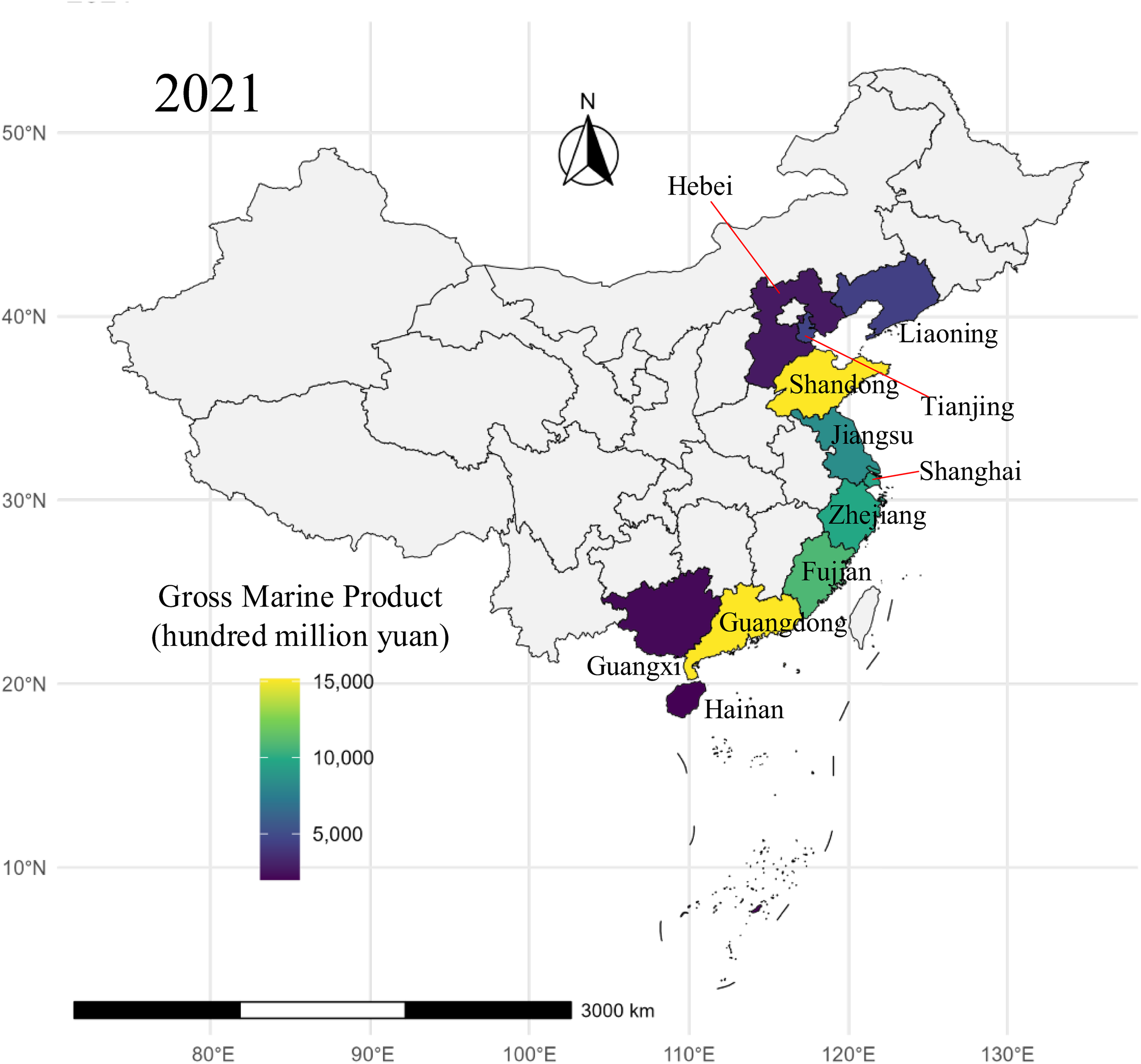Figures 2 , 3 display the time series of gross ocean product for each coastal province and the spatial distribution of gross ocean product in 2021, respectively. Several key insights emerge from these figures:
