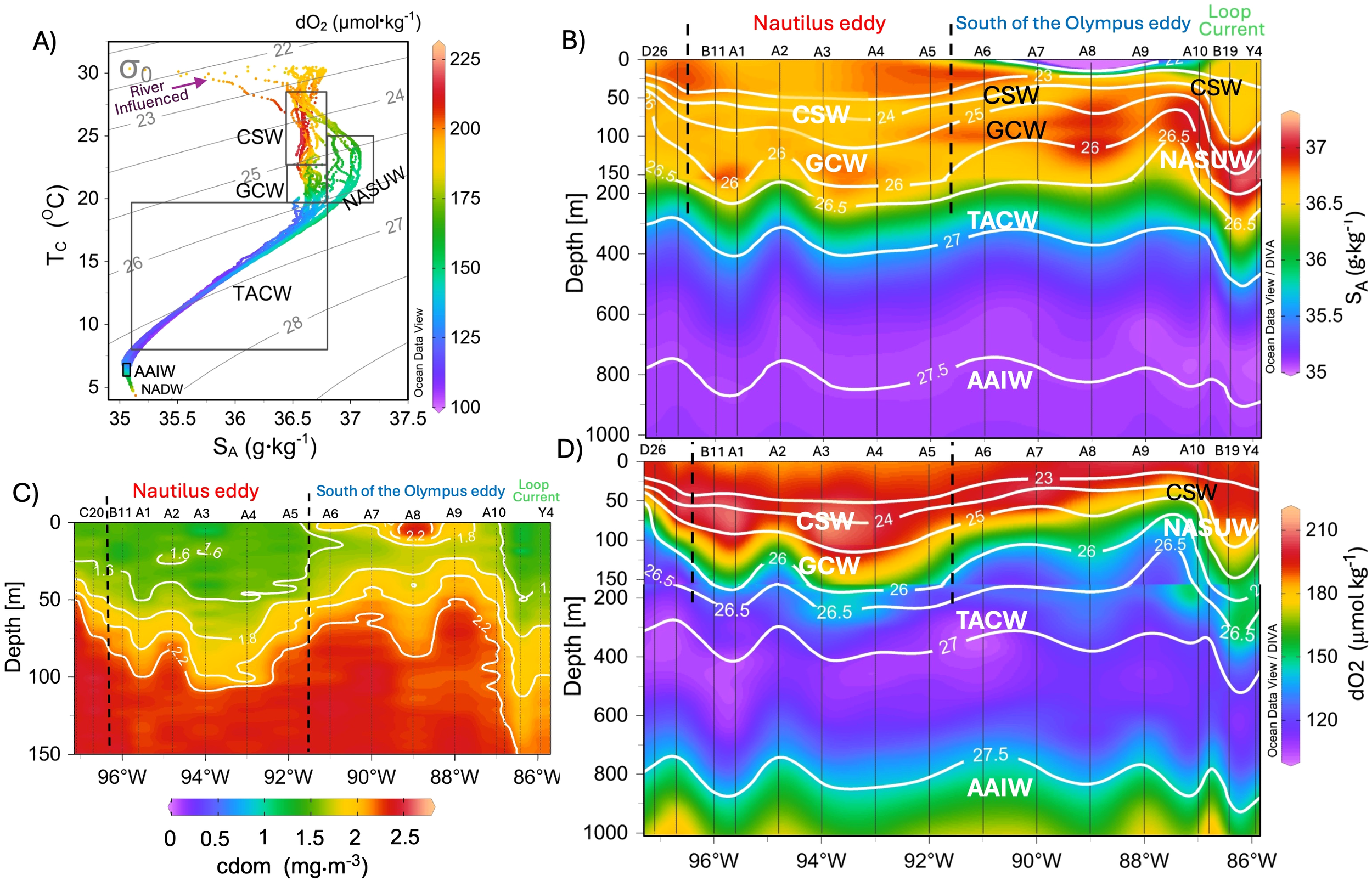 (A) Conservative temperature–absolute salinity (Tc–SA) diagram, and sectional distribution of (B) absolute salinity (SA), (C) chromophoric dissolved organic matter (cdom) and (D) dissolved oxygen (dO2) during the first leg of the XIXIMI-4 cruise. In panels (B–D), the sampling station positions are shown at the top, and the black vertical dashed lines show the approximate extension of LCE Nautilus. Potential density anomalies (σt) are drawn as white solid lines in panels (B, D). Note that the sectional distribution of cdom is shown for the upper 150 m layer in panel (C). The water masses present in the GoM were identified according to the classification of Portela et al. (2018): Caribbean Sea Water (CSW), Gulf Common Water (GCW), North Atlantic Subtropical Underwater (NASUW), Tropical Atlantic Central Water (TACW), and Antarctic Intermediate Water (AAIW). This figure was generated with Ocean Data View (Schlitzer, 2024).