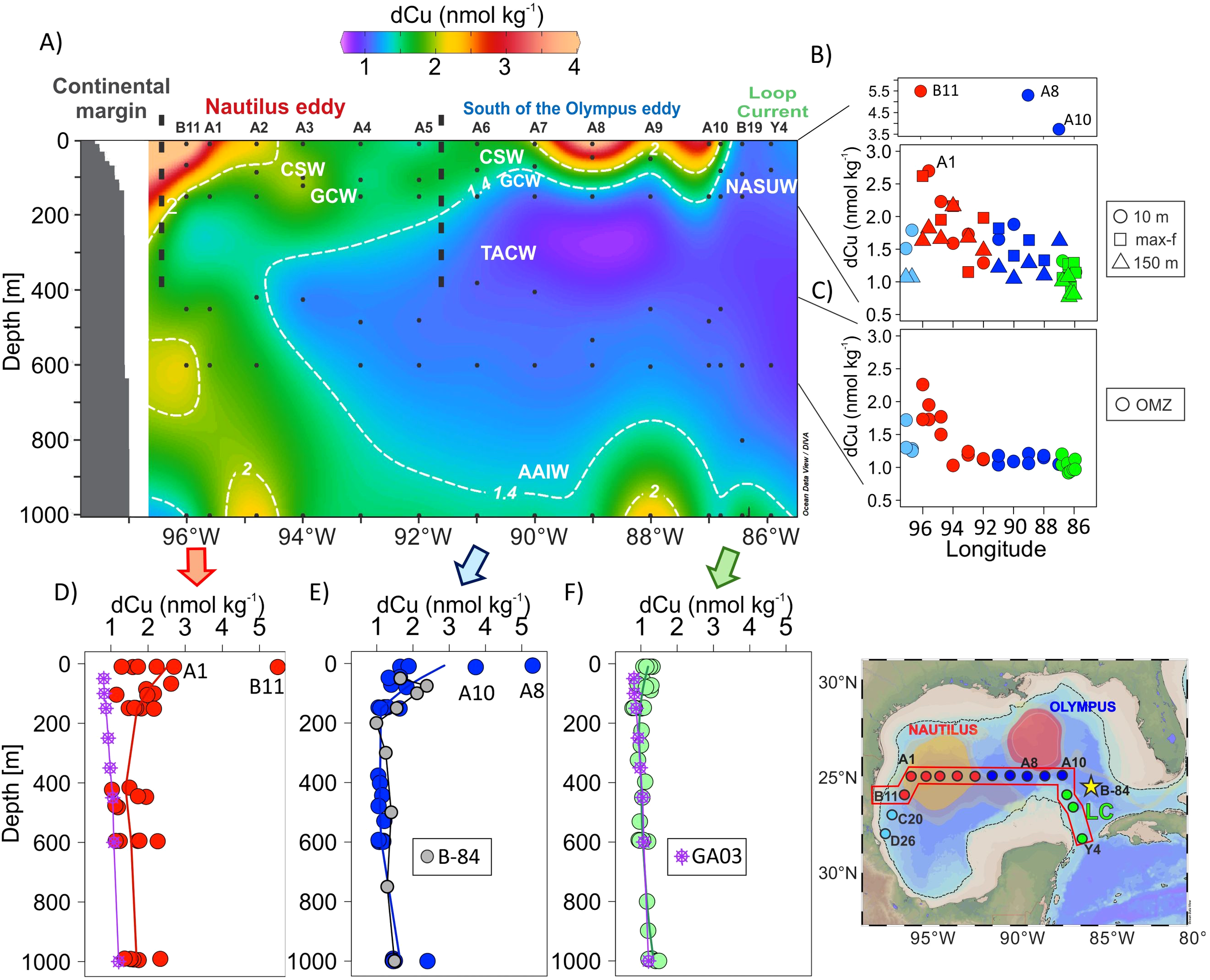 Between 150 m and 600 m depth, TACW intrusion was observed from the Yucatan Channel, with very low dCu values associated with the OMZ (Figures 3A, 2D; Supplementary Figure S1A). This dCu minimum (x̄ = 1.10 ± 0.08 nmol·kg–1) in the OMZ was found to extend west to station A3. However, upon arriving to the west of LCE Nautilus, the dCu concentration in this layer (including stations A2, A1, and B11) significantly increased (x̄ = 1.82 ± 0.26 nmol·kg–1; tstudent, p < 0.001) (Figures 3A, C). Thus, dCu enrichment in the western GoM occurred not only at the surface but also in the subsurface layers, likely associated with the interaction of LCE Nautilus and the continental margin of the western GoM. Finally, the dCu concentration at 1000 m depth along the entire transect was somewhat variable and, relative to the dCu minimum in the OMZ, was slightly elevated (x̄ = 1.59 ± 0.35 nmol·kg–1) (Figures 3A, D-F; Supplementary Figure S1A).