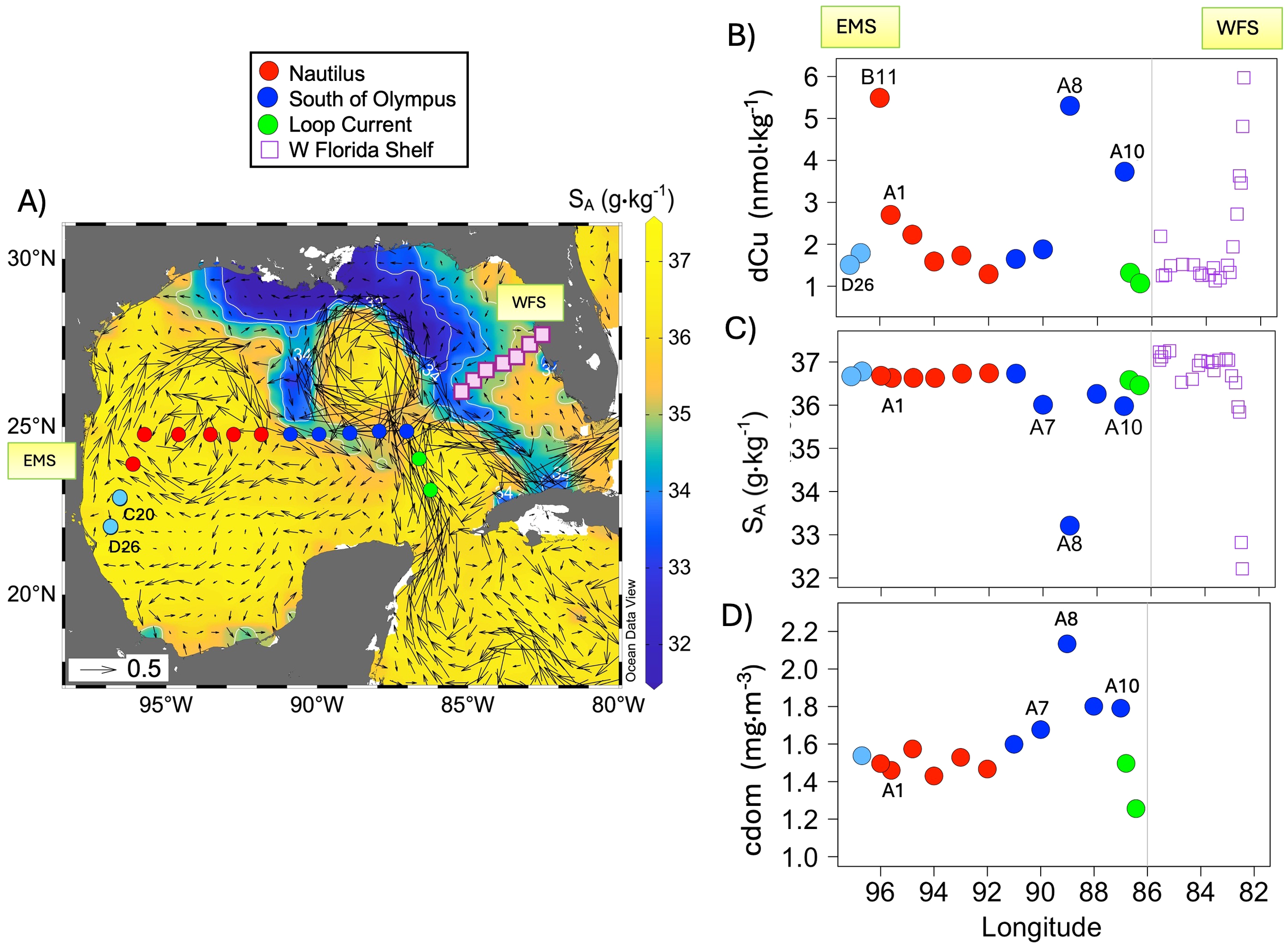 (A) Spatial distribution of satellite-derived sea surface salinity (SSS: color scale) and mean satellite-derived geostrophic velocity field (m s-1) from 27 August 2015 to 3 September 2015. Longitudinal profiles of (B) the concentration of dissolved copper (dCu), (C) absolute salinity (SA), and (D) chromophoric dissolved organic matter (cdom) at 10 m depth along a transect from the Eastern Mexican shelf (EMS; this study) to the West Florida shelf (WFS). The samples for dCu concentration and salinity from the WFS (purple squares) were collected in June 2015 and reported by Mellett and Buck (2020). The stations in all panels are colored as follows: Loop Current (LC; green circles), south of Loop Current Eddy (LCE) Olympus (blue circles along 25° N), LCE Nautilus (red circles). The labels next to the symbols show the station identifiers. The figure in panel (A) was generated with Ocean Data View (Schlitzer, 2024).