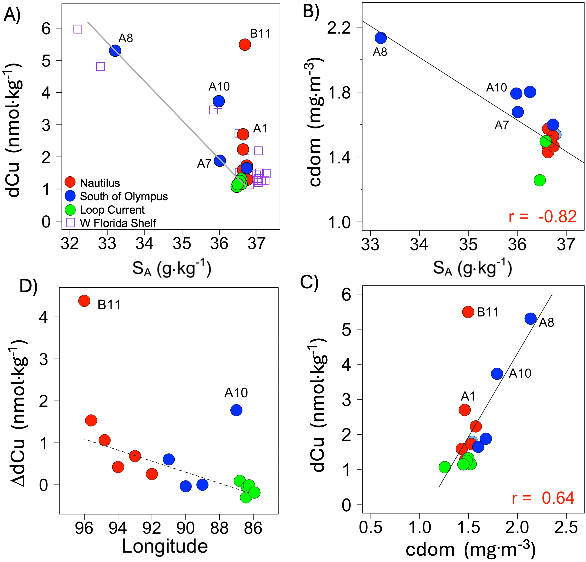 Distribution of (A) dissolved copper (dCu) and (B) chromophoric dissolved organic matter (cdom) as a function of absolute salinity (SA) at 10 m depth along the transect during the XIXIMI-4 cruise. In panel (A), a simple mixing model was used to predict the dCu concentrations that resulted from the mixing of freshwater from the Mississippi-Atchafalaya River system with seawater from the Loop Current. Data from the West Florida shelf (WFS) (purple squares; Mellett and Buck, 2020) are shown for comparison and were not used in the mixing model calculation. (C) Longitudinal profile of the concentration of non-conservative dCu (ΔdCu) at 10 m depth along the transect from the eastern coast of Mexico to the Yucatan Channel. The ΔdCu concentration at each station was calculated as ΔdCu = dCumeasured – dCumixing, where dCumixing is the dCu concentration predicted by the line of mixing at the SA measured at each station. The dashed line in (D) was included to indicate the westward spatial trend. (D) Relationship between surface dCu and cdom along the transect. The labels next to the symbols in all panels represent the station identifiers.
