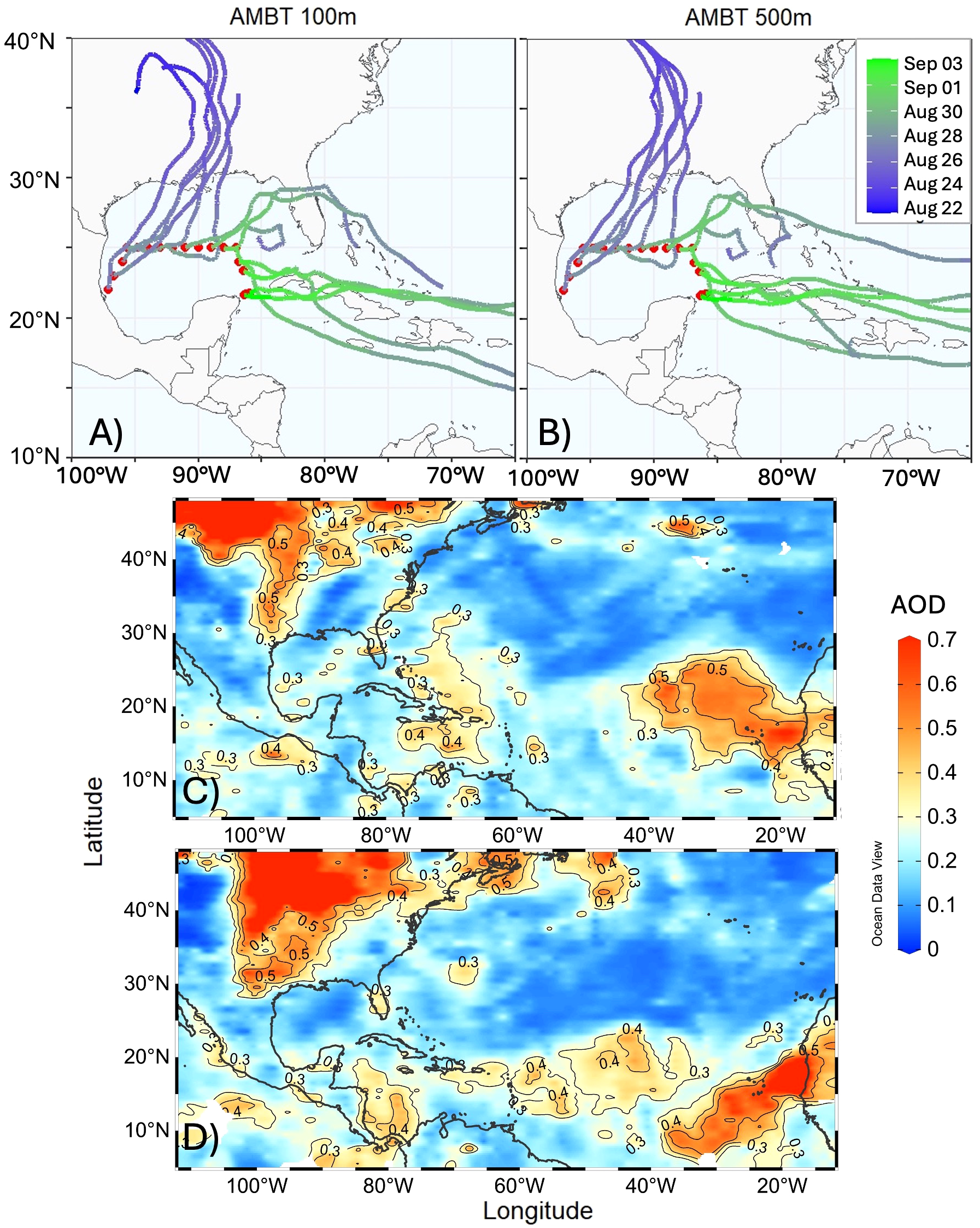 Five-day air mass back-trajectories (AMBTs) derived from the HYSPLIT model for the period of 22 August 2015 to 3 September 2015 (color scale). Red circles in panels A-B represent the sampling stations along the transect during the first leg of the XIXIMI-4 cruise. AMBTs were computed for all stations with an ending height of (A) 100 m and (B) 500 m above sea level. Spatial composites of the aerosol optical depth (AOD) over the Gulf of Mexico (GoM) and Atlantic Ocean from the NASA MODIS-A satellite at 550 nm averaged over the period of (C) 26 August to 28 August and (D) 29 August to 31 August.